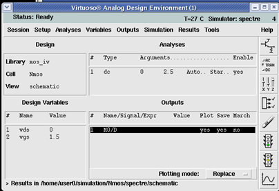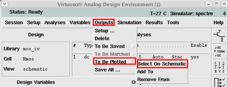 按照上图方式选择之后,界面会自动跳到原理图的界面,用鼠标点击NMOS的漏极,选择该点为输出测试点。完成之后ADE界面如下图所示