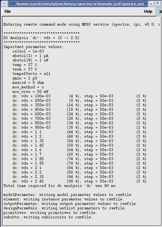 点击之后,仿真器会对该电路进行仿真,本次设计比较简单,很快就可以出结果。完成仿真之后会出现一个specture的仿真报告,以及我们需要的特征曲线。