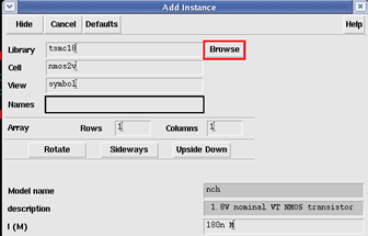 按钮或者快捷键按i即可添加元器件。通过browse选择不同库下的不同cell;2