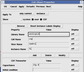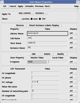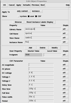 所有的vdd、gnd、电流源vdc、vpulse以及电容cap均选择analogLib库,mos管选择tsmc18中的pmos2V和nmos2V。电流源以及负载电容参数设置如下表: