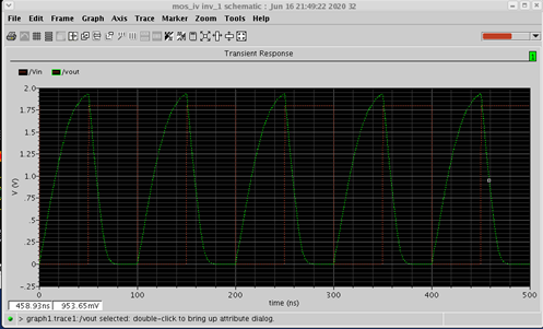 最终的波形如下图,此处不再截取网表报告信息。可以看出,选中的红色线条net17是输入信号的波形,高电平是1.8V,绿色线条是输出vout pin 的波形,与输入是反相的。