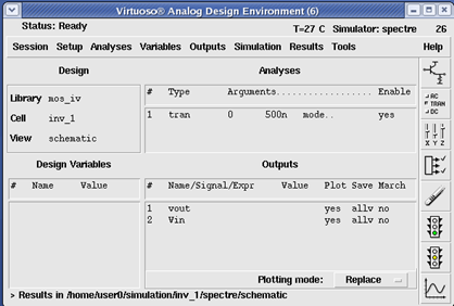 接下来就可以进行仿真,除了按照上章中的方式进行仿真,也可以用过点击ADE界面右侧工具栏选择倒数第三个按钮