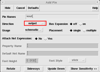 选择输出output,方式和上章中相同。界面会自动跳到原理图的界面,用鼠标点击pin vout和栅极输入的net(本例中该线条通过打label名称是Vin,视频中为net10)。完成之后ADE界面如下图所示。