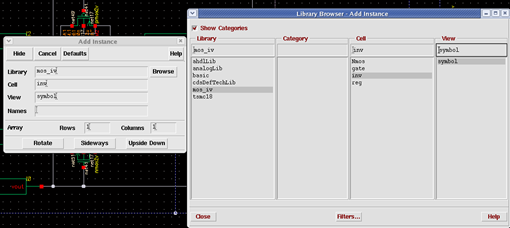 3.接下来就编辑整个设计原理图,调用之前生成的inv,晶体管选择和前几个实验一样。