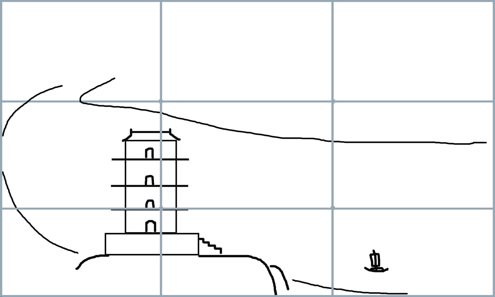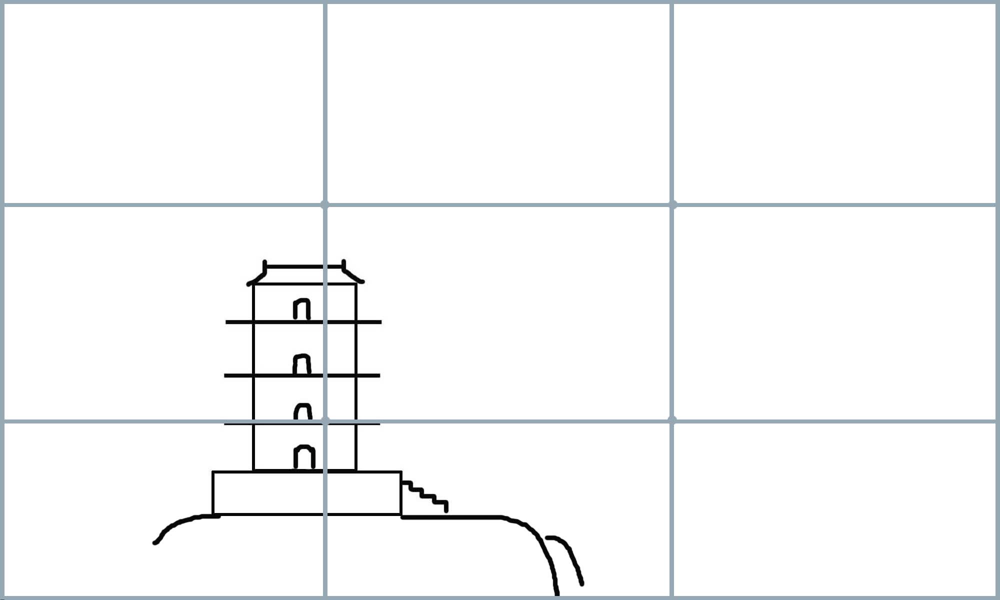 首先,如图3-14将画面设置大小为(6x10)cm规格的方形。将主题的主体鹳雀楼放在画面九宫格左下角的交点上,形成画面的近景。因鹳雀楼是画面的主体,它的高度将到九宫格的上三分线上,宽度将到右边的三分线左右。