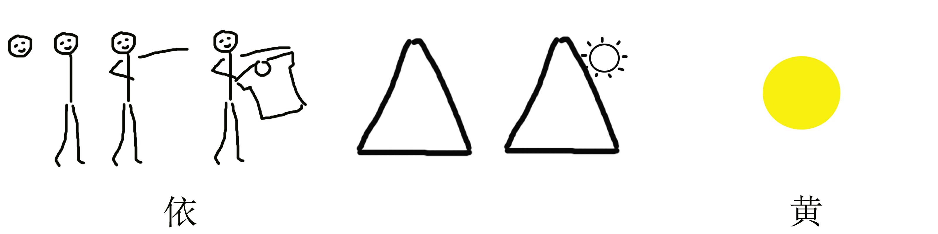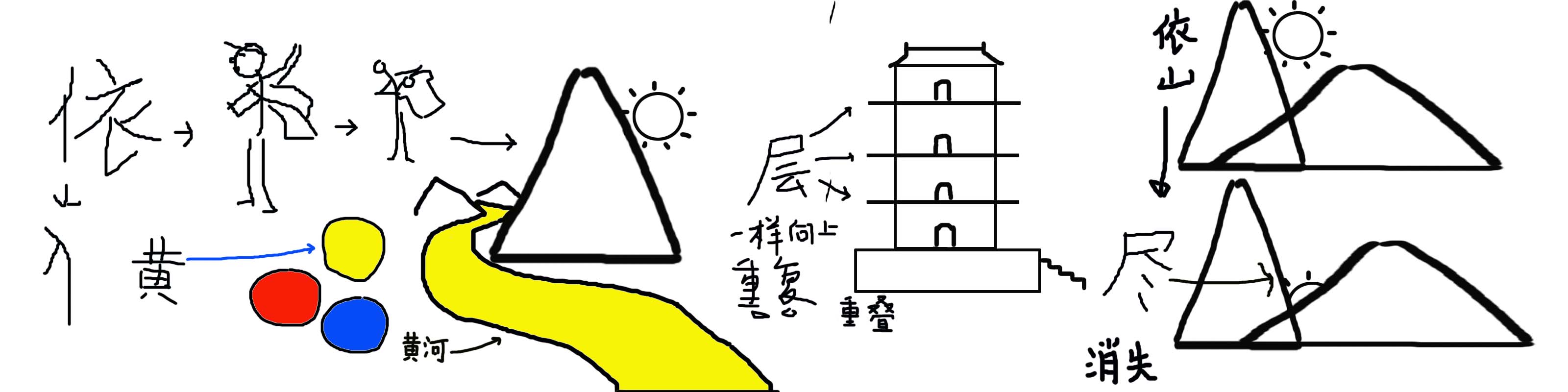 生字教学简笔画构思过程草图如图3-18。“依”,是人“靠”衣服遮羞保温保暖的意思,单人旁设计成人的形象,右边画上衣服,切合“依”字的象形。“黄”即是黄色,小学二年级学生是认识知道黄色的色相,直接用黄色的圆形表示就可以了,黄河的河水就是黄色的,加深学生理解课文意思。“层”,同样的形状物体一个加上一个向上重叠就是“层”,如鹳雀楼外观3层4檐,内部为9层使用空间。“尽”,这里可以理解为消失或沉没,用两个图表示太阳靠着山沿不断消失的变化过程。
