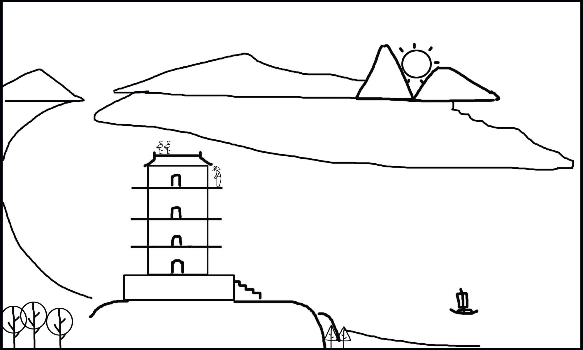 最后,如图3-17把诗人、鹳雀和树安排在合适的位置,古诗《登鹳雀楼》的教学简笔画稿的第一部分就完成设计了。