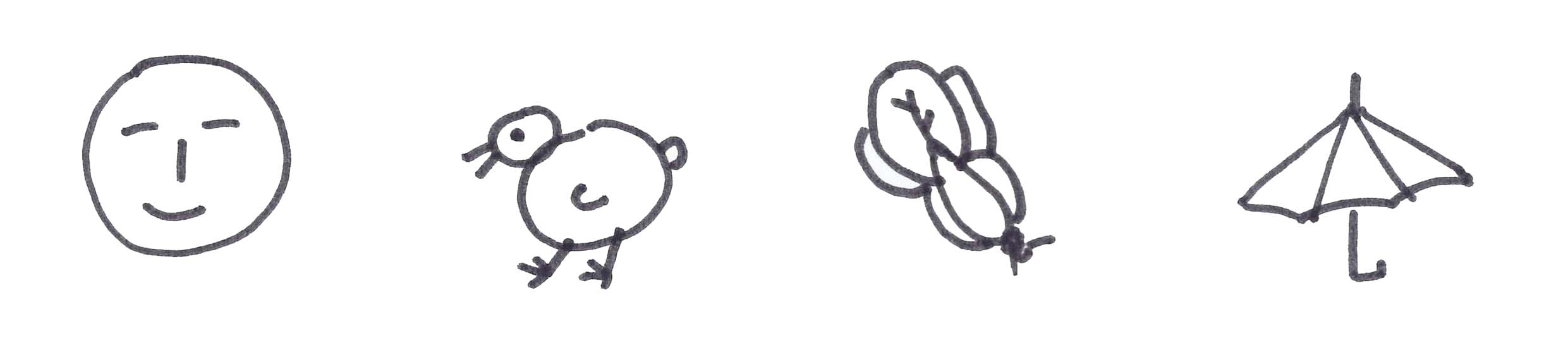 概括符号化也体现在人们脑海里形成的形象记忆。如说到画人脸,立马就可以用一个圆圈,加上两短线条代表眼睛,一竖线代表鼻子,竖线下面加一条向下弯的线条代表微笑的嘴巴,人脸就生动地展现在眼前了。动物、植物、生活用品等等都是如此如图1-13。