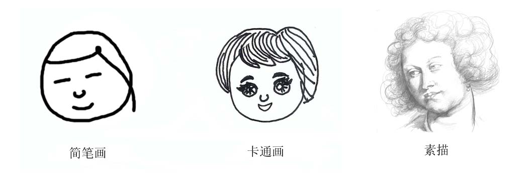 如图1-11简笔画、卡通画和素描等的比较。同样是画女孩的形象, 简笔画只用一笔线条画圆形表现头的外形,而且不需要求太准确,也不能重笔,画出来的形象特点有点感觉,感觉是这类型的女孩形象就可以了。发型轮廓也只用一笔线条画成,眼睛只用两根短线线条画出即可,眼睛的眉、眼帘、眼球瞳孔等都被这两根线代表了,省略了许多线条表现细节。卡通画画的眼睛就多用了很多线条来表现细节,更不像素描那样还要画出明暗五大调子变化,透视、比例与结构都要非常准确,素描单单画女孩头部轮廓线不能用一根线的圆形代替了,而是要用许多线、面来表现准确的结构和丰富的变化。通过简笔画、卡通画与素描画女孩比较的例子会发现,简笔画女孩形象,人们看后就能记住而且也不需要美术专业知识及技能就可以画出来,感觉简单易学易记。素描、卡通画等画种,没有良好的造型能力是画不好的,而且要经过长时间学习才能掌握的。