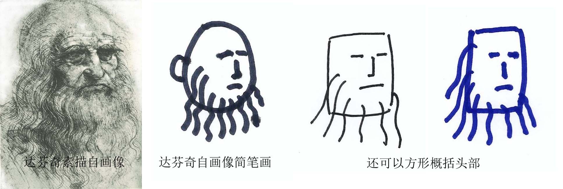 比如图1-12素描达芬奇的自画像,人们看过以后就可以知道此画画的是达芬奇。而简笔画用圆去概括他的头部,再用几根波浪曲线画须发,最后用几根线条将五官添加出来,表现出来的画已看不出是达芬奇了,而是长胡子的这一类老人的形象了,这个简笔画形象已经变成了长胡子老人的代表符号了。