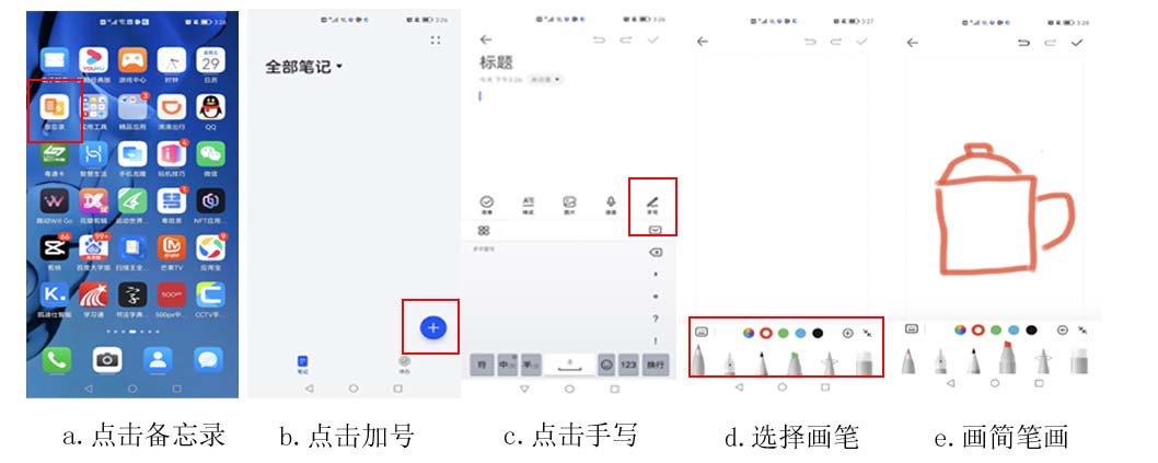 手机作为简笔画的绘画工具是非常有时代意义和现实意义的。一般的手机界面上都会有“备忘录”的选项。只要点击它进入备忘录后,点击右下角的加号,再选择右下角的“手写”选项,就可以选择大小合适的画笔和自己喜欢的颜色开始画画了。步骤和方法如图1-22红色方框所示。