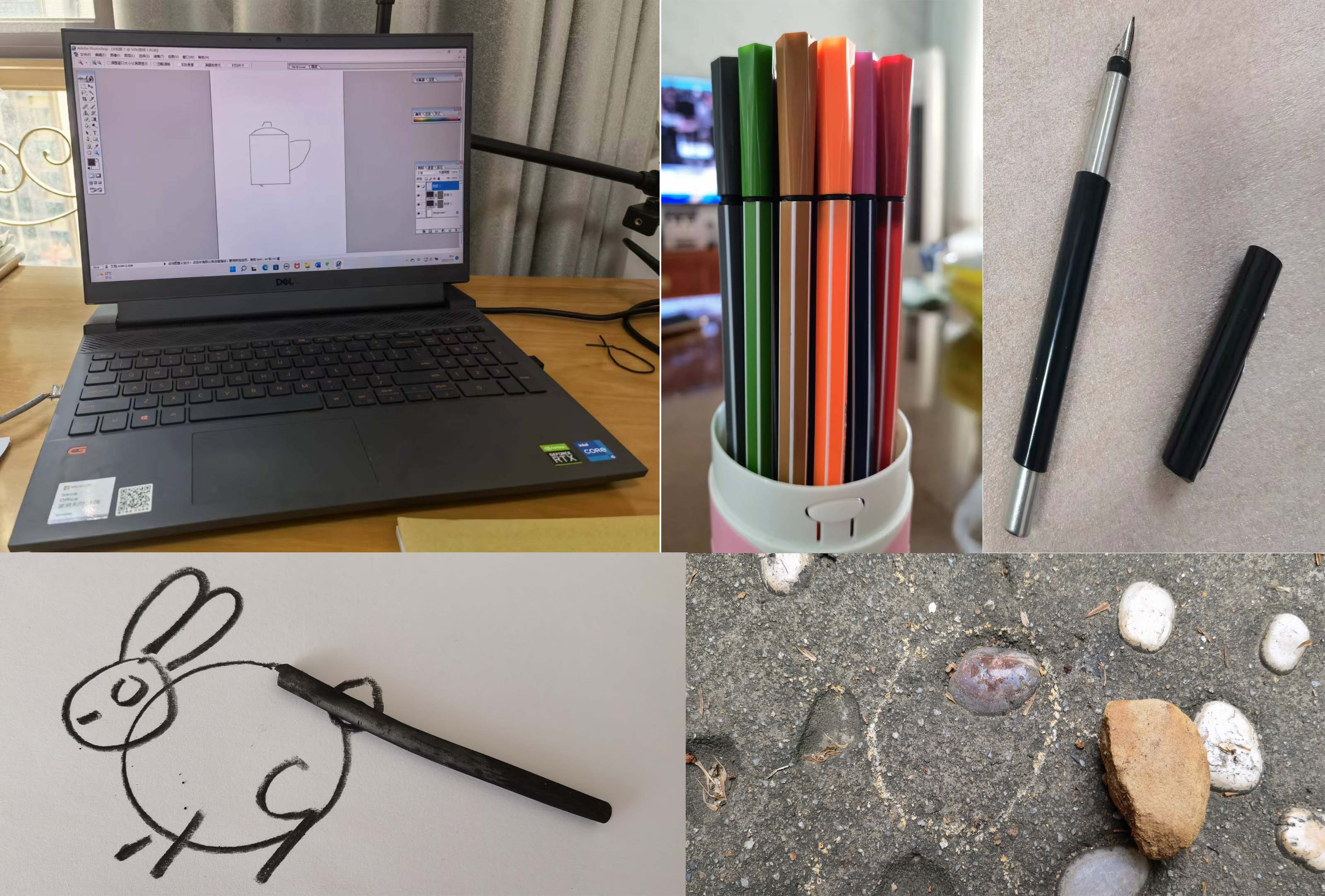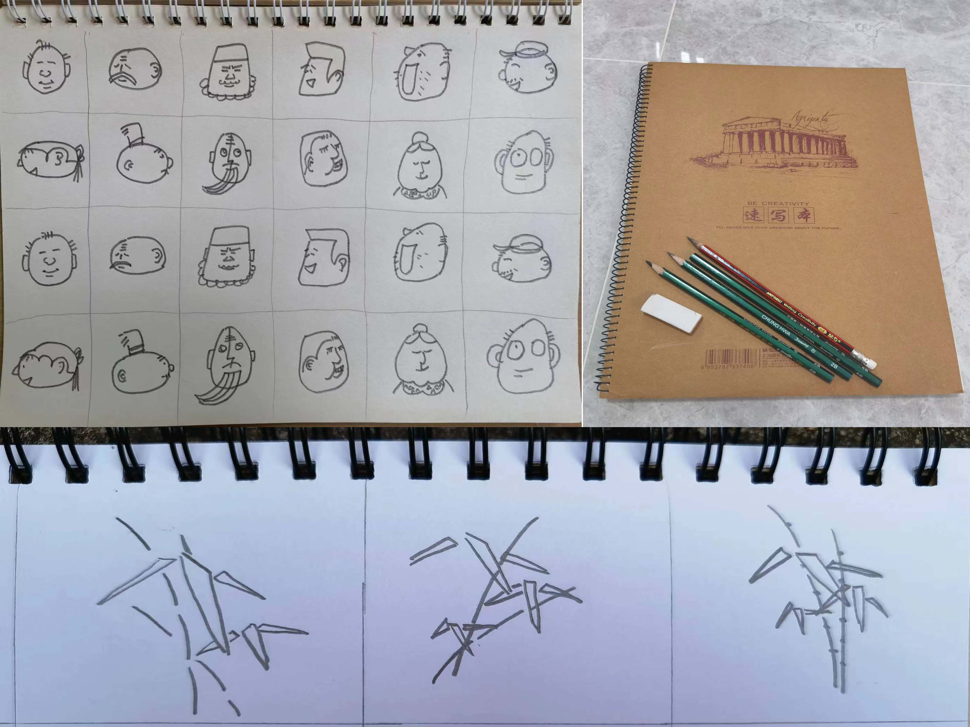 师范生在简笔画课堂进行训练最好使用铅笔与速写本,也可搭配橡皮擦。铅笔选择2B型号较为合适,最好不使用橡皮擦,培养一次性把要画画完成,如图1-21 。