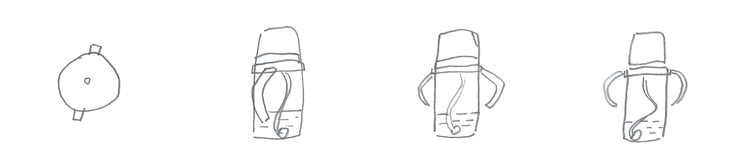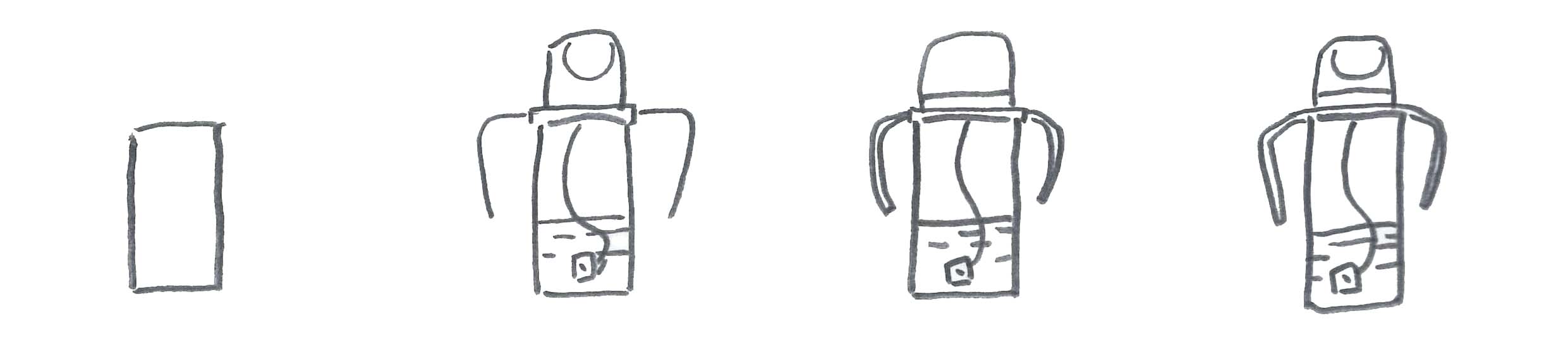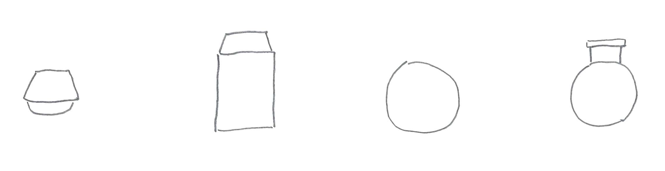学会观察。世界上的所有事物展现人们面前有着各种各样的形态,在画者的头脑里要有只用几个几何形,用来抽象出这些事物最简练最恰当的形的方法。如果学会这样观察世界,简笔画就入门了。但有的事物不是一个几何形就能概括与表现的,需要由几个几何形根据事物的前后、比例及结构规律组合而成图1-26。