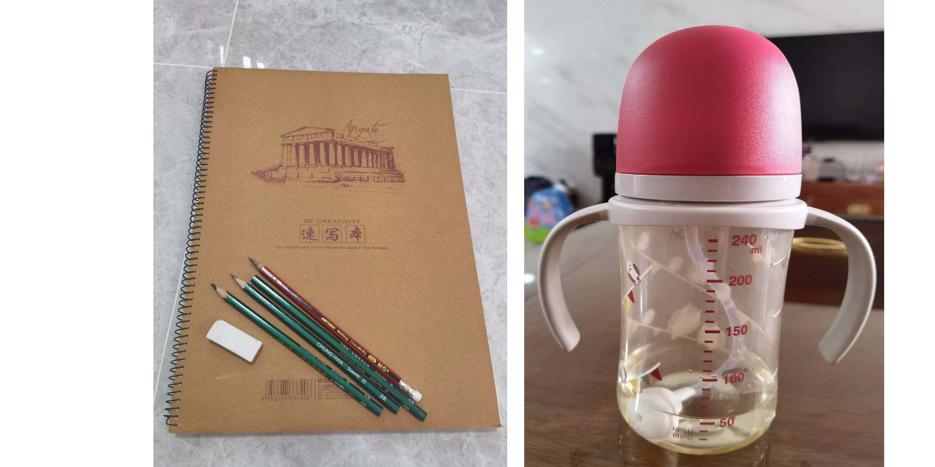 在速写本上,用简笔画方法按实物写生的步骤画水杯。