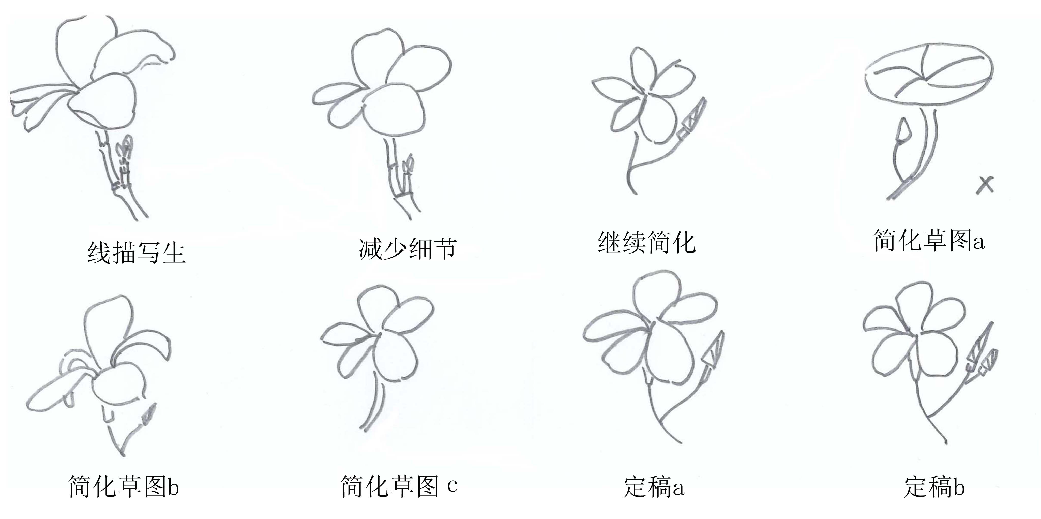 第三,简化提炼。观察的过程中包含了从复杂到简化的提炼步骤,如用简笔画表现下图的花。写生简化提炼过程如图1-30。过程:线描写生——减少细节——继续简化——设计最简的运笔顺序——定稿。