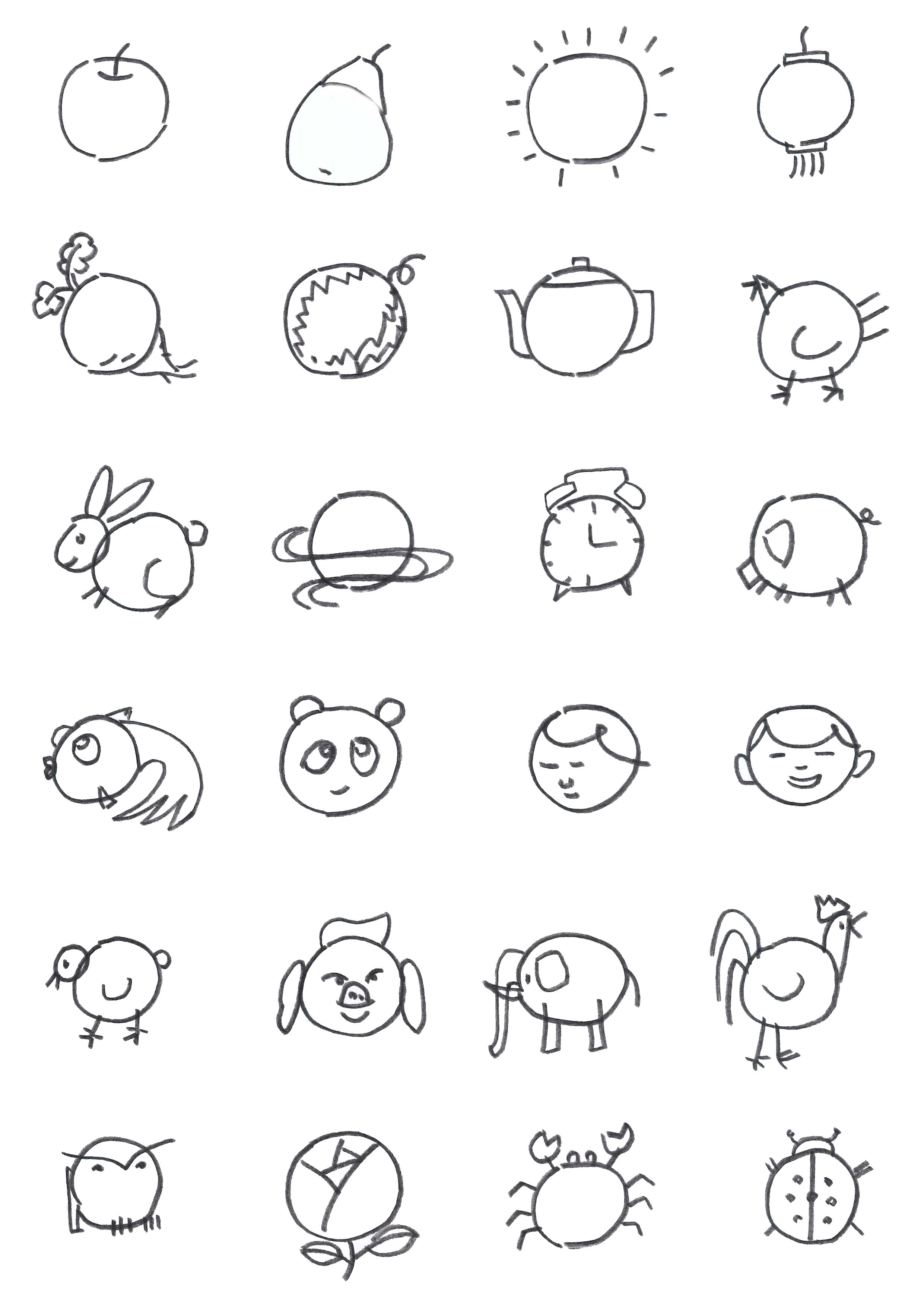 下面谈谈简笔画临摹的全过程。这里选择的临摹范本为编者在教学过程中,从各种绘画资料临习得来的全部以圆形为外形特征简笔画习作。