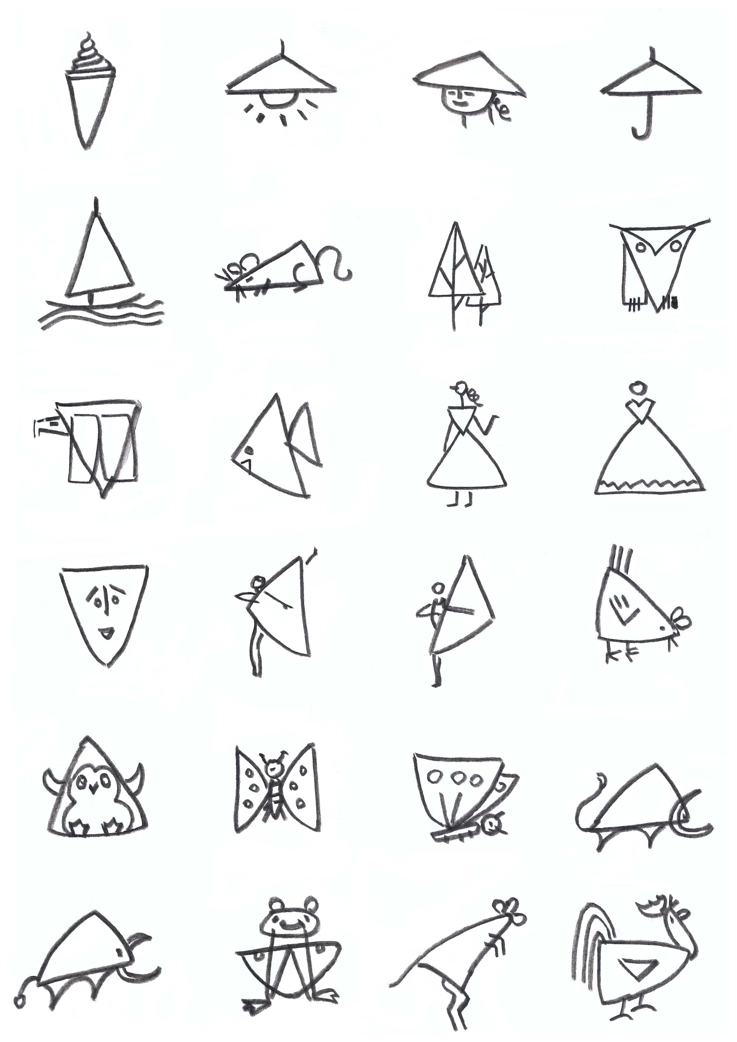 这里,只列举了在许多相同的圆形上添加少许几笔就变出许多事物的简笔画形象的临摹方法。其它如方形、三角形的方法是一样的,这里就不再赘述了,可参考图1-35和图1-37。