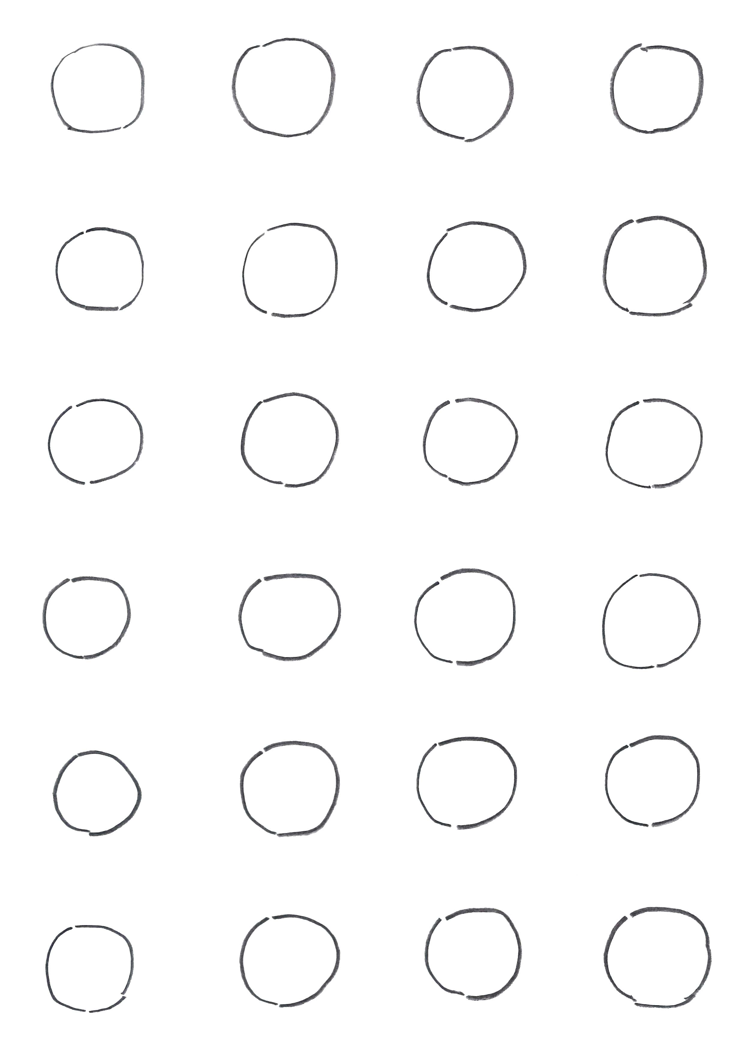 步骤一:首先,在十六开纸大小的速写本上将一张纸分为二十四格。格子大小要均匀,格子线徒手用铅笔直接在纸上画,不能借助尺子等直线工具的辅助,格子线要浅要细要直,淡淡的线条自己能看的到就好了。其实在实际教学中学生要把这一步骤完成的好还是很不容易的,需要不断地训练画格子才能完成上面描述的要求。然后,在每一个小格子里画上同样大小的一个圆圈,圆圈可以一笔画成,也可以分段画成,线条粗黑浓重,画出来的线条尽量不修改不重复,圆圈不必象圆规画的那么圆,基本圆就可以了。圆圈画在格子里要居中的位置,离格子四边线有一定的距离,要留出足够的位置,这里必须做到意在笔先,做好总体布局和安排,为完成最后感觉上要整齐美观的效果,圆与圆之间要有行有列,不互相拥挤靠得太近为好,为步骤二添加笔画做好准备。这一步对于学习简笔画有着非常的意义,在一张纸上画那么多又相同的圆圈,又要考虑这个圆圈最后成为某件事物的简笔画符号,而且二十四个圆圈变成二十四个不同的某件事物的简笔画符号,本身就是一种挑战,需要学习者对位置、线条的准确把控,如图1-33。