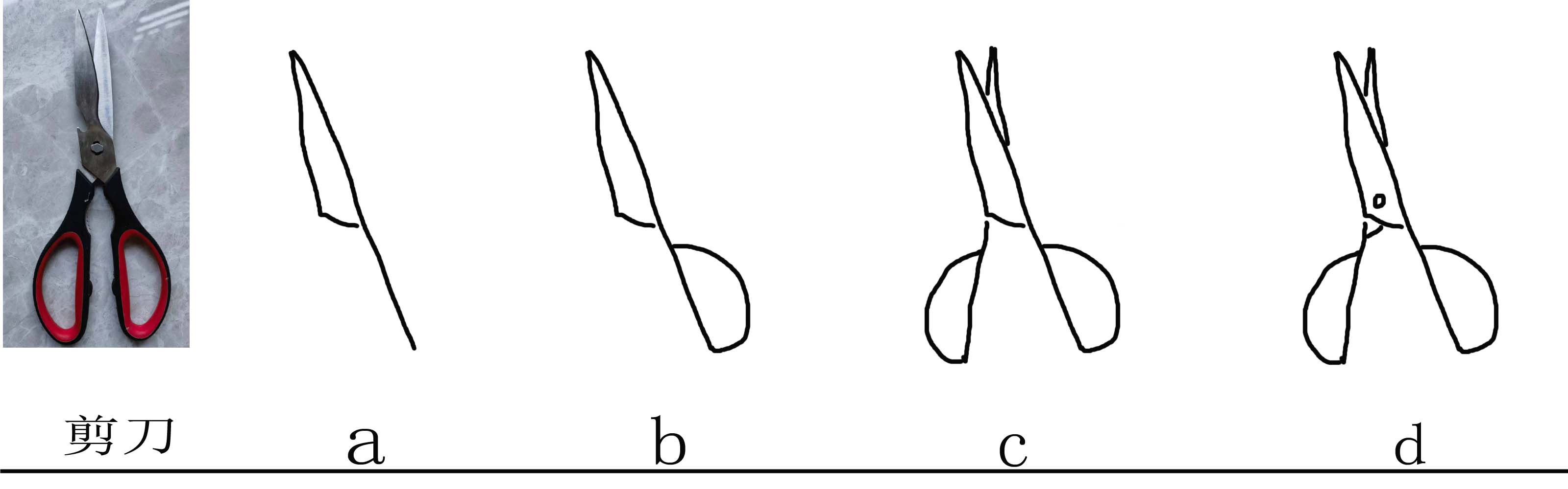 剪刀。俯视为最佳观察表现的剪刀角度。画剪刀不能从剪刀的整体外部特征三角形去观察分析表现。应从剪刀的结构出发,把剪刀分为剪、轴、剪柄和剪把四个部分。然后把各部分的形画出来,先画三角形为剪,拉长其中一条边为剪柄,剪柄上接上半圆为剪把。同样方法画另一半,注意下面的一半与上面衔接的部分要断开以表现上下部分的区别。最后添上小圆为剪刀的轴。实际教学中先由学生观察表现剪刀,多数会照葫芦画瓢画成双廓线的剪刀,不敢也不会用单线表现。