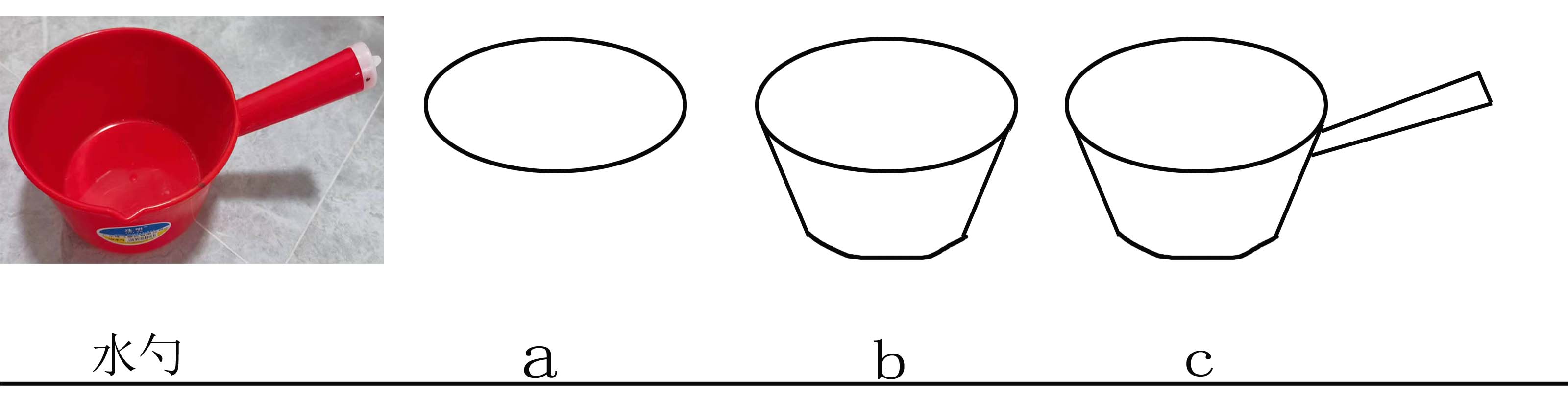 水勺。侧俯视为最佳观察表现的水勺角度。先画椭圆,次画倒梯形表现深度,最后方形画勺柄。