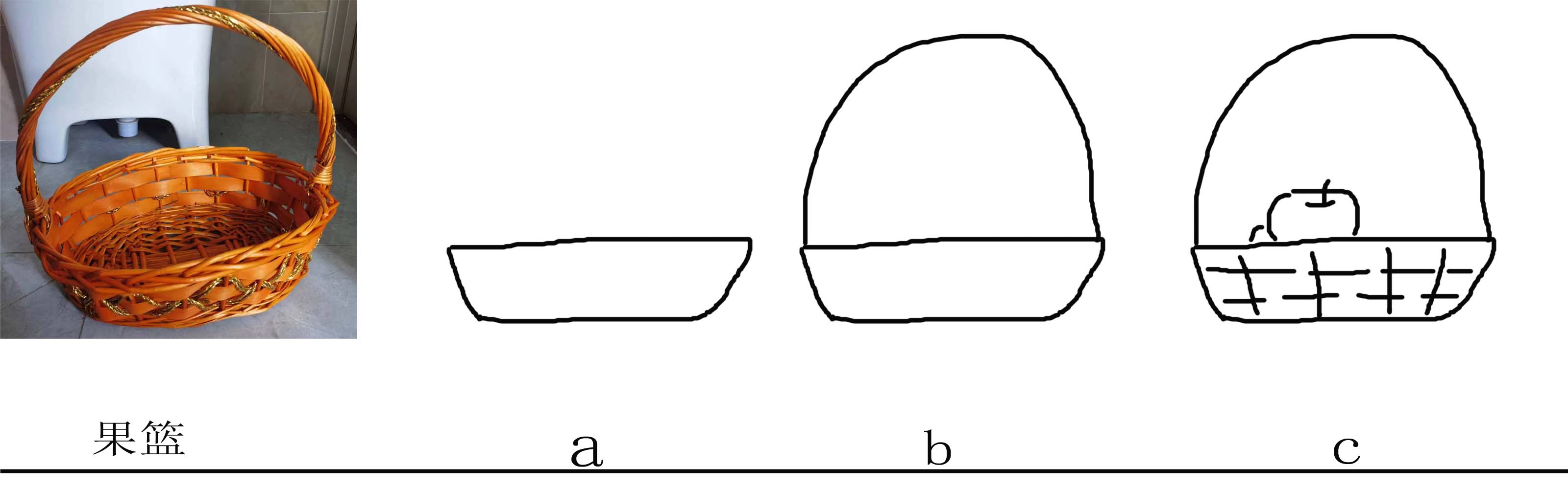 倒梯形概括果篮主体,有许多藤条扭成的果篮提手减省为单曲线表示,最后添加少许的果篮的特征线条。