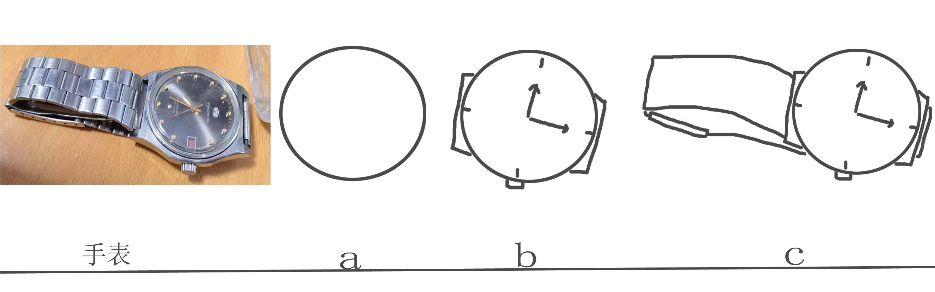 手表的简省方法:表壳结构层次丰富,只简为一个圆代表,表带只简为方形即可,复杂变为简单。