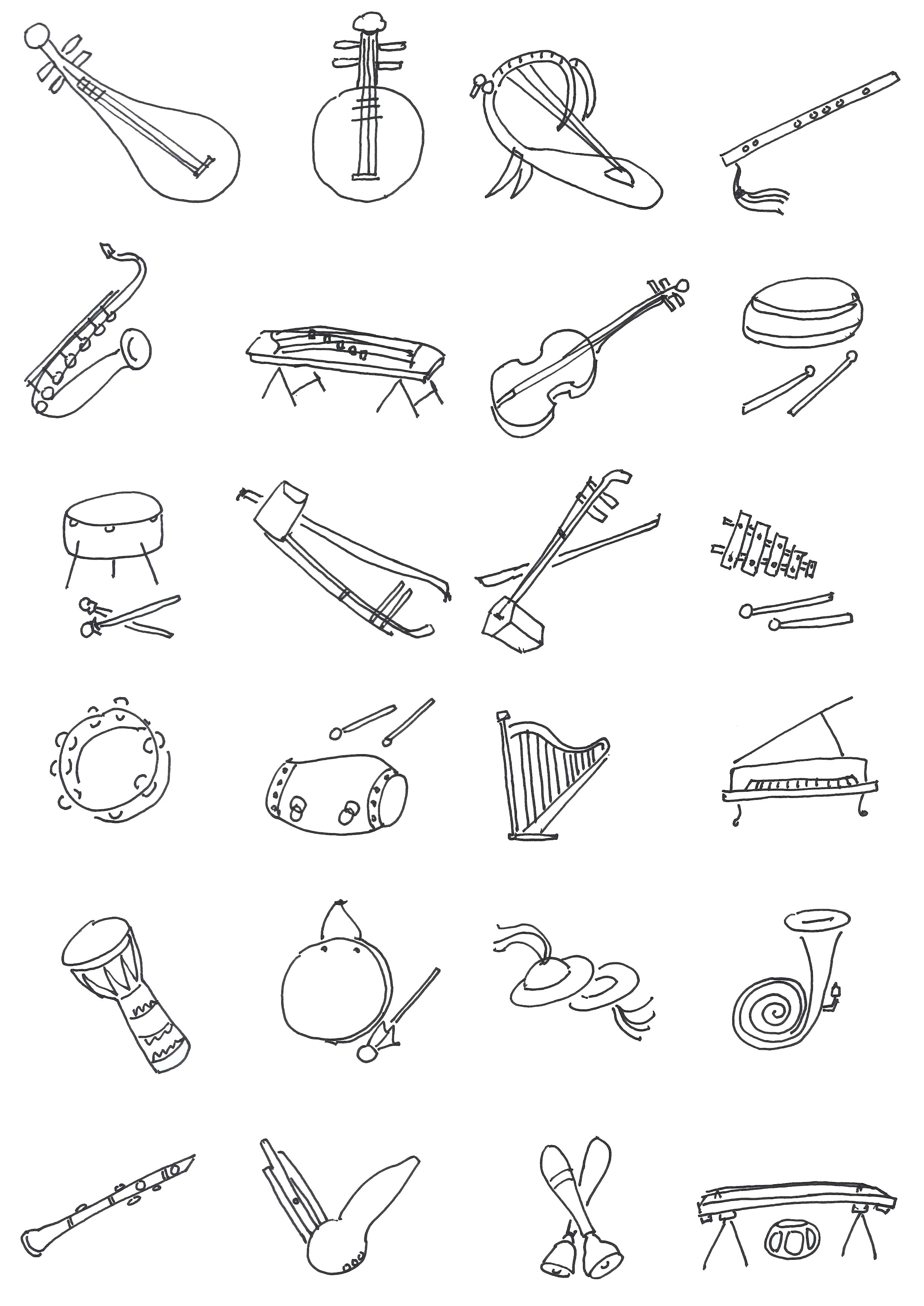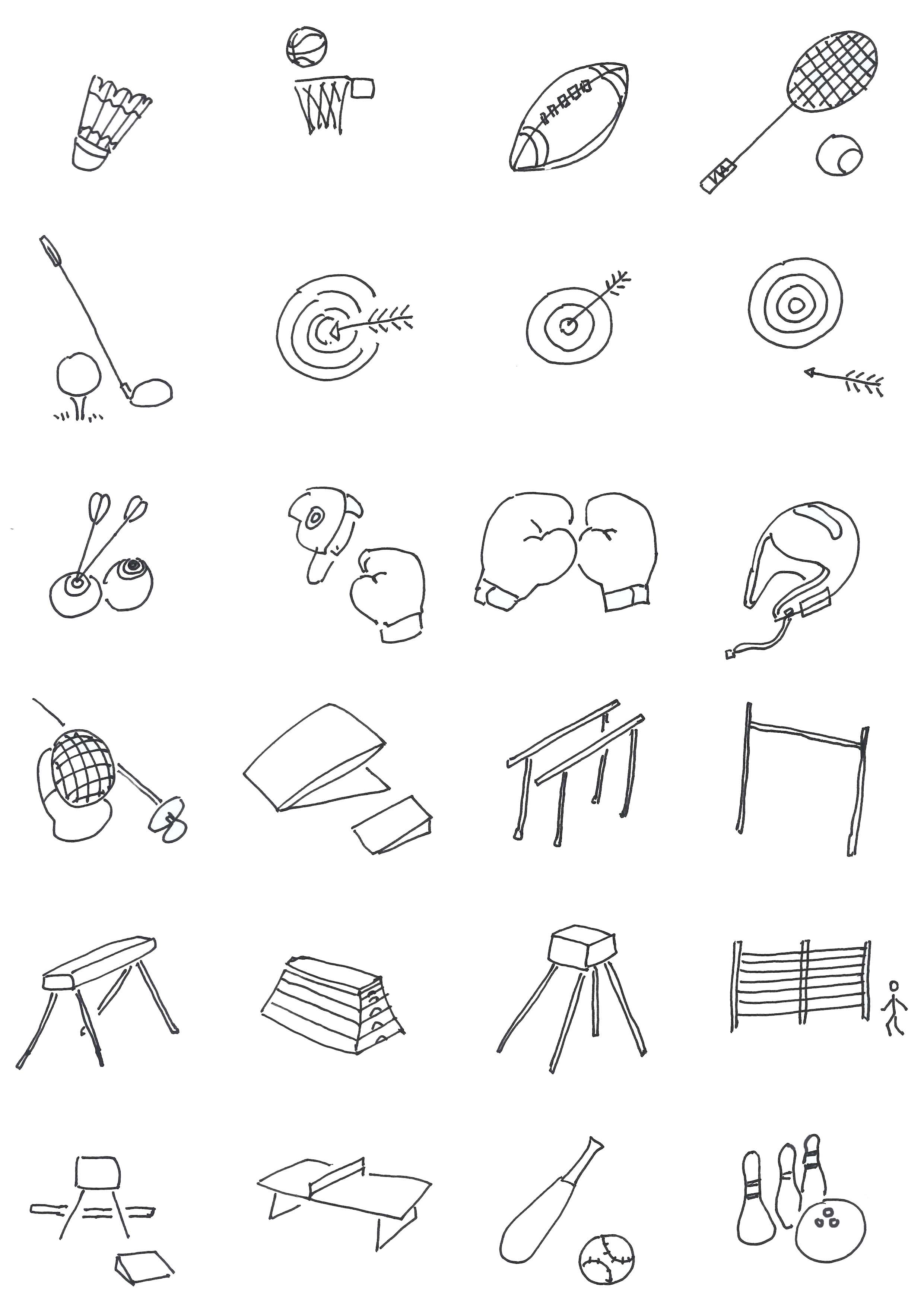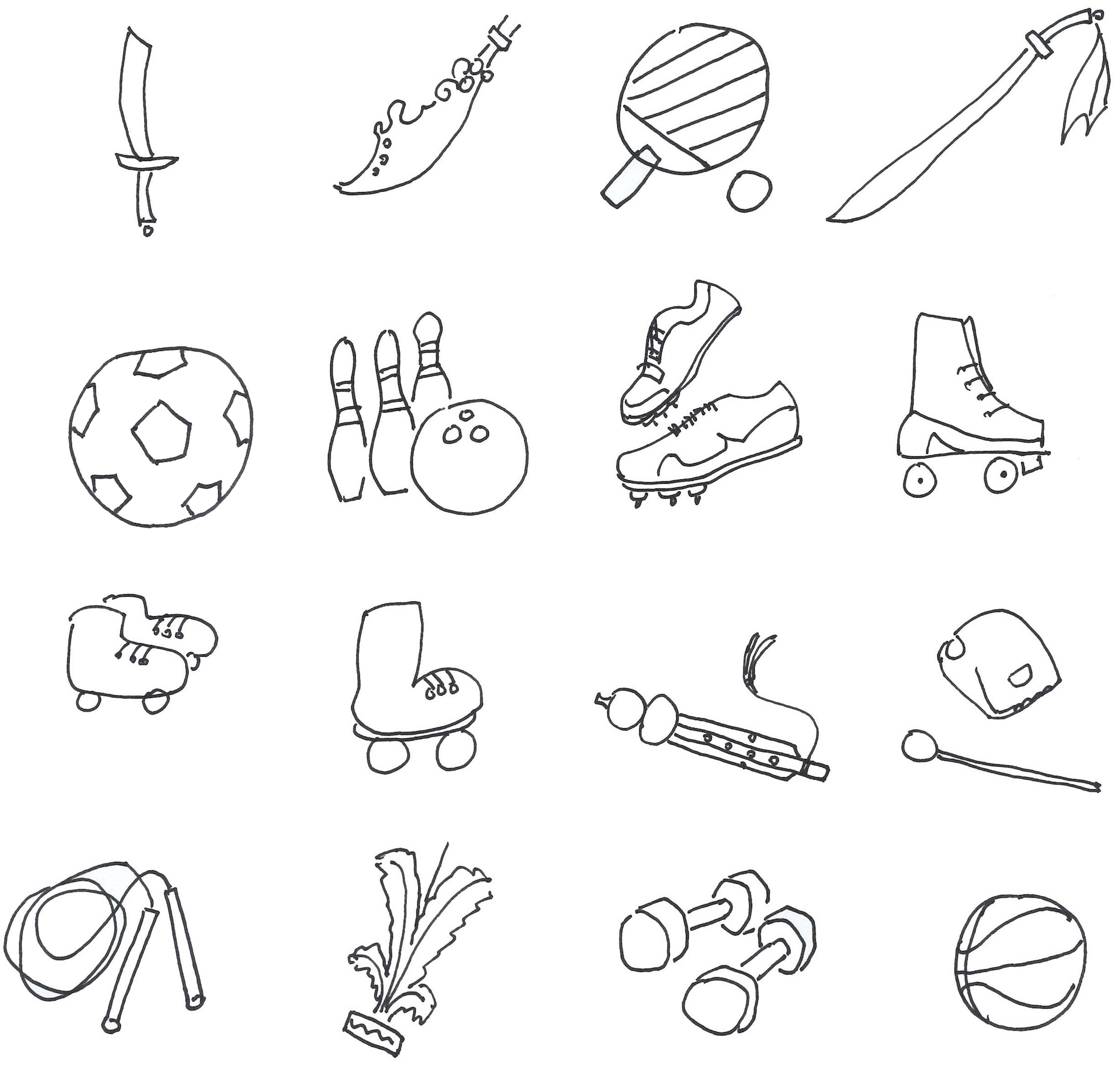 文艺和体育的工具与用品非常丰富,通常称为文体用品。简笔画有时很难准确表达文体用品的形象,这个问题的解决可以通过“场景与用品的组合表现法”来实现。如画乒乓球和高尔夫球,单单画一个小圆不配组合物是分辨不出画的是什么,配上高尔夫球杆后圆变成了高尔夫球,如图2-13的第二行第一个图,配上乒乓球拍后圆变成乒乓球了,如图2-15第一行第三个图。
