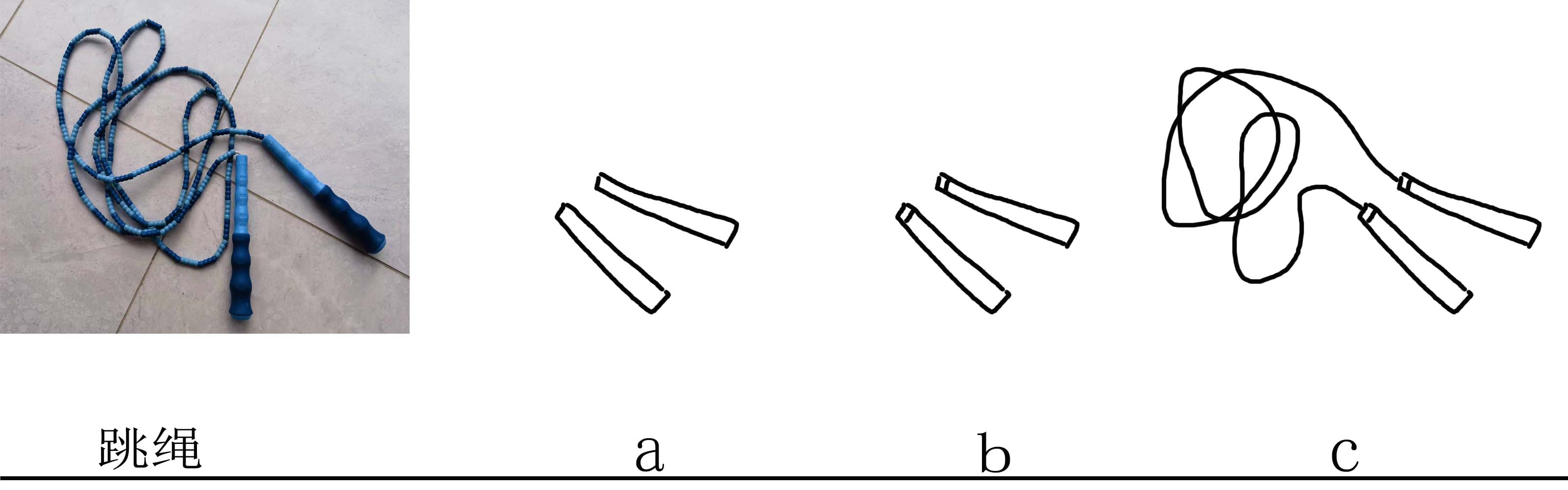 方形画跳绳两端绳柄(硬),短横线装饰,自由曲线画绳子(软)。