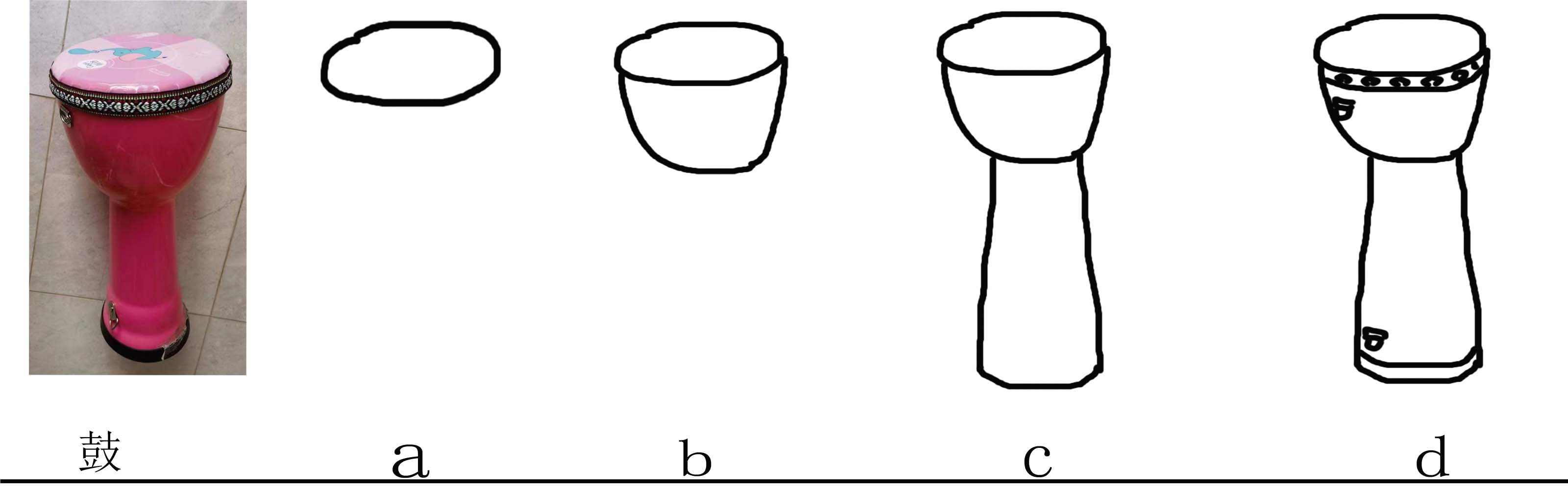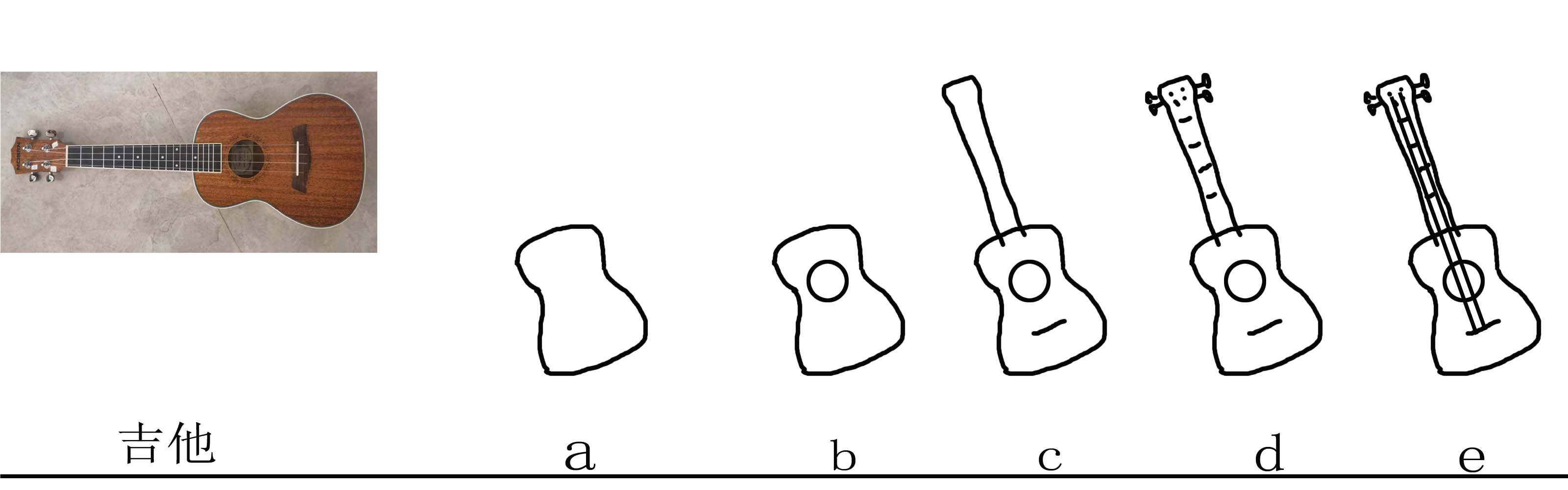 方圆结合形画吉他的主体部分,圆形画音孔圈,细长方形画音指板及琴头。椭圆画鼓面,半圆画鼓身,方形画鼓座,最后添加其他结构线。