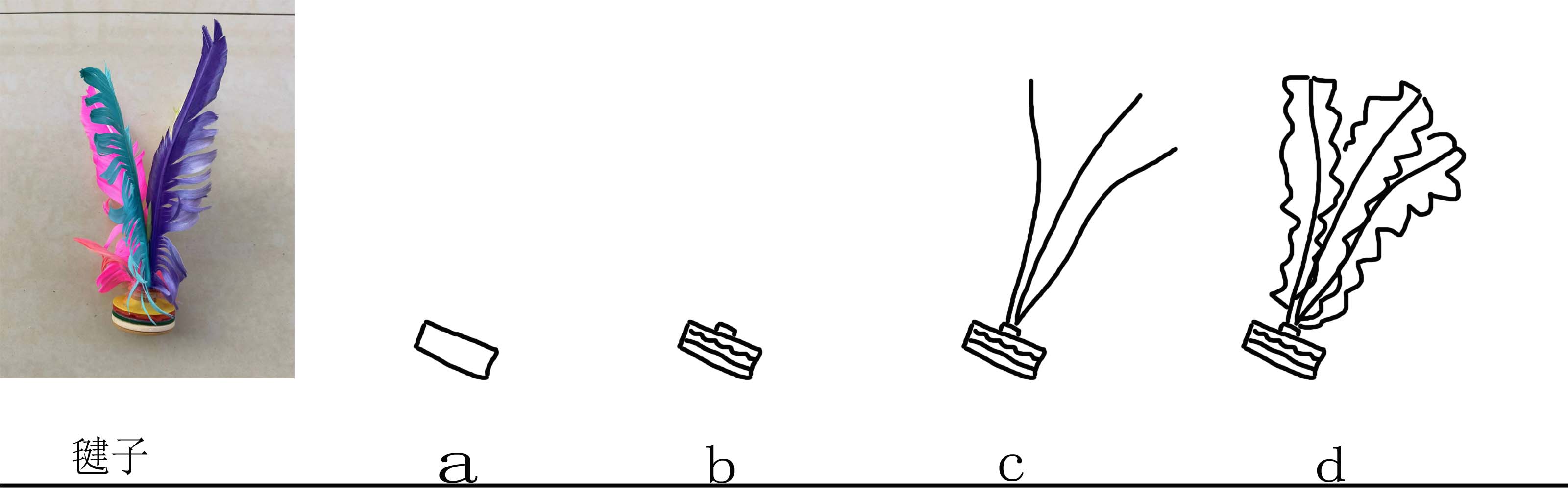 方形画毽子底垫,三根线画羽柄,以曲线画羽形。