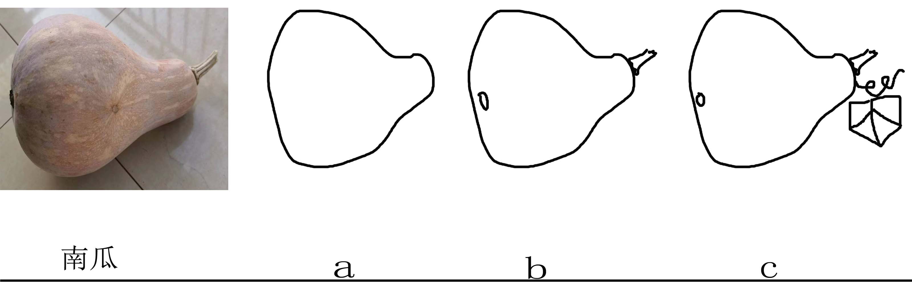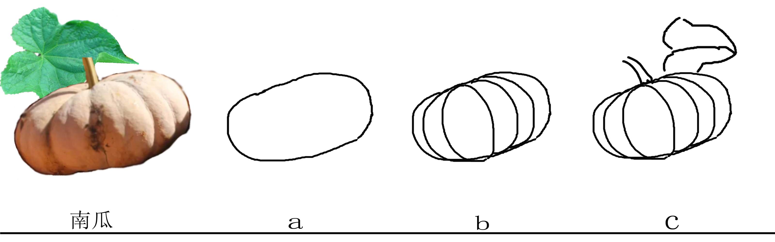 瓜瓣鼓起比较明显的南瓜。椭圆画瓜的主体,然后依次用弧线将瓜瓣由大到小地表现,最后添上瓜柄和南瓜叶。