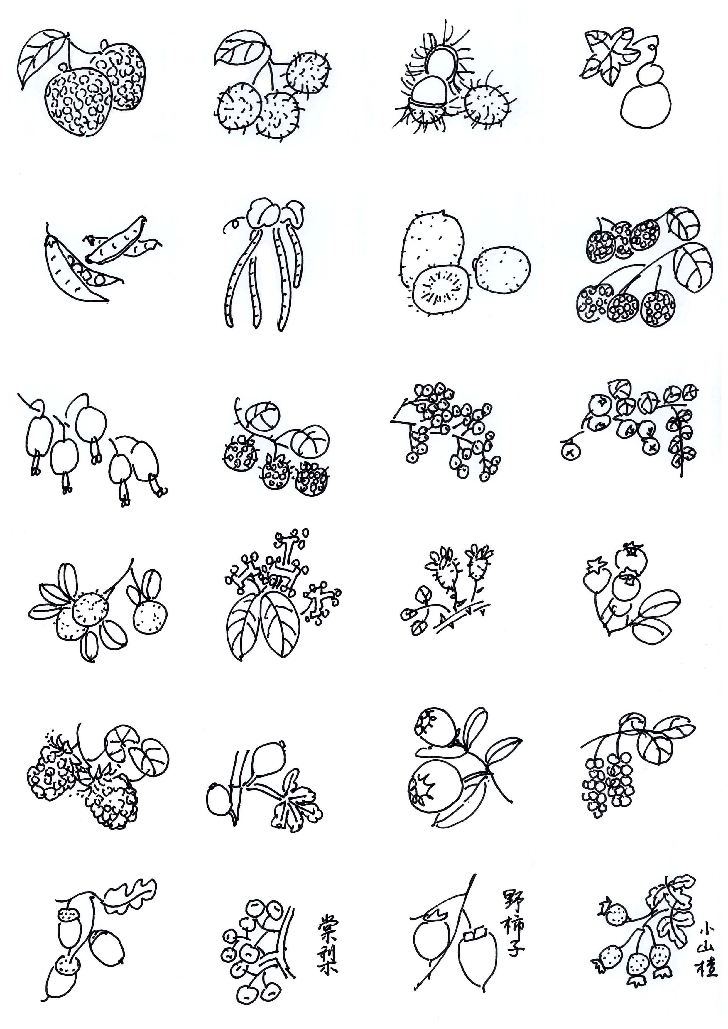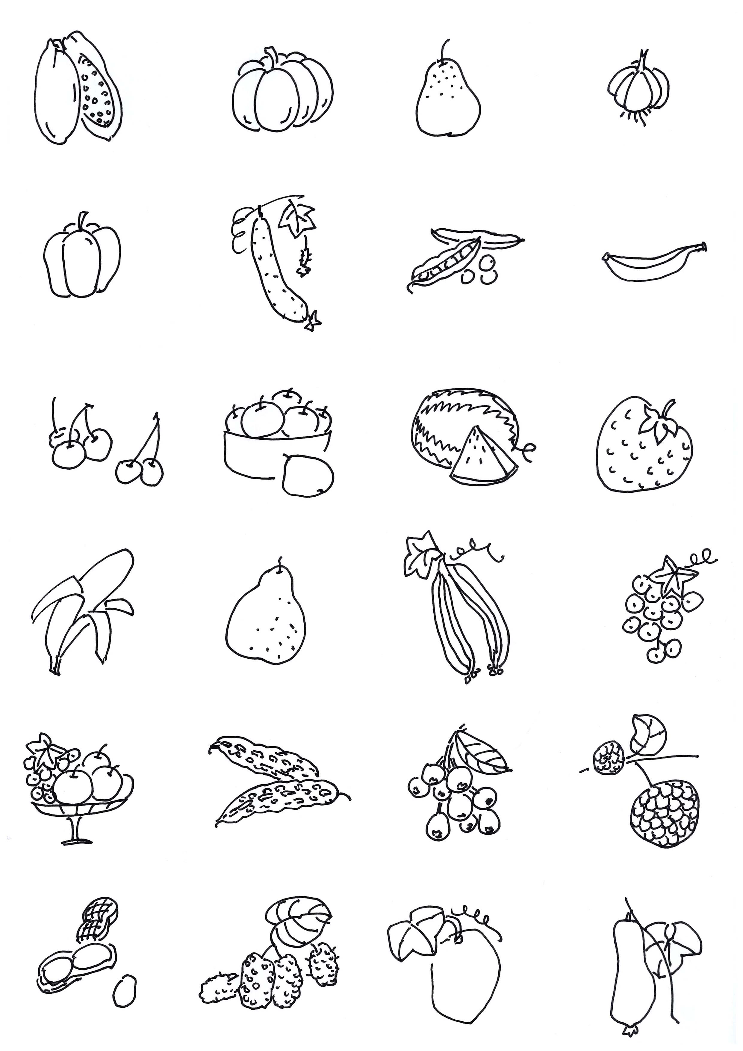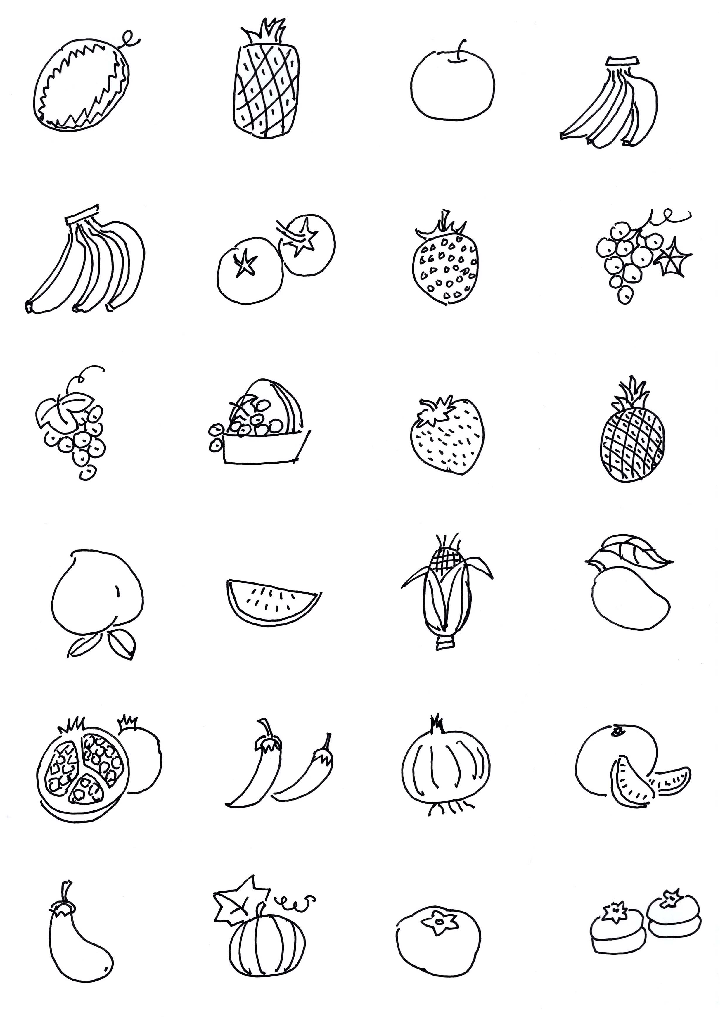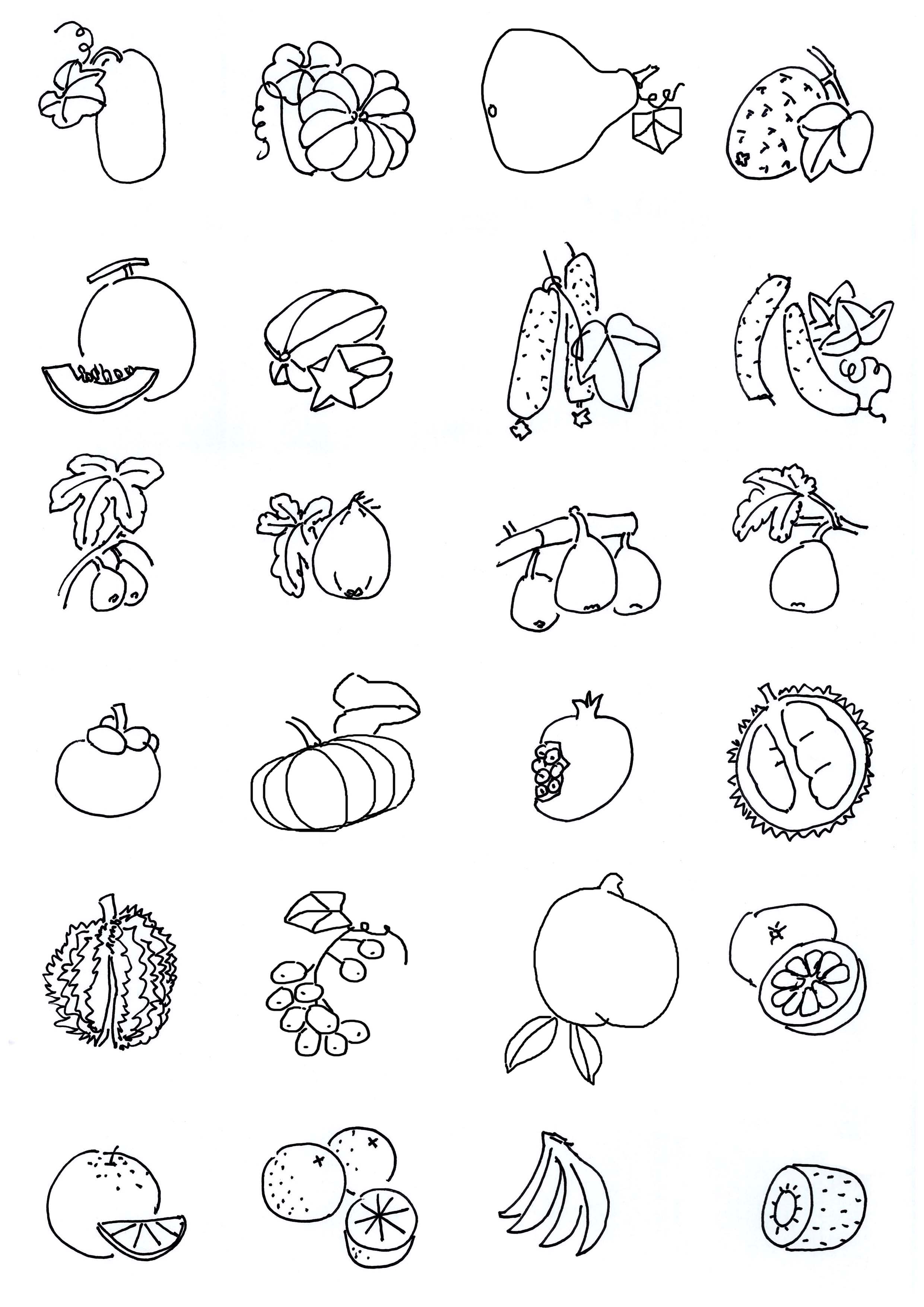 瓜果种类繁多,形态基本上是以圆形居多,有的圆形分瓣,有的是长条形的。由于形态相近,画好瓜果简笔画关键在特征细节的把握。如图2-17中的哈密瓜、山竹、鹰嘴桃、橘子和橙子等的外形基本都是一致的,添加不同特征细节的点、线后,所体现事物的质感就不一样了,山竹的光滑和橙子凹凸的表面。
