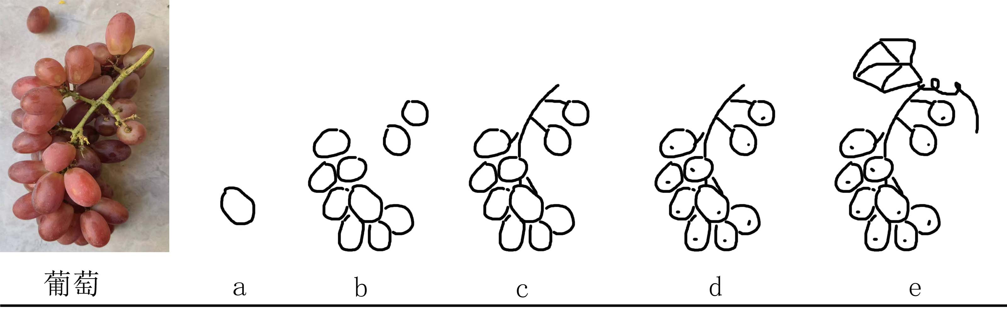葡萄是由许多小椭圆形组成一串的果实,注意椭圆方向是向着果柄的,添一小点表示高光质感,最后添画葡萄叶和丝以显新鲜生动。