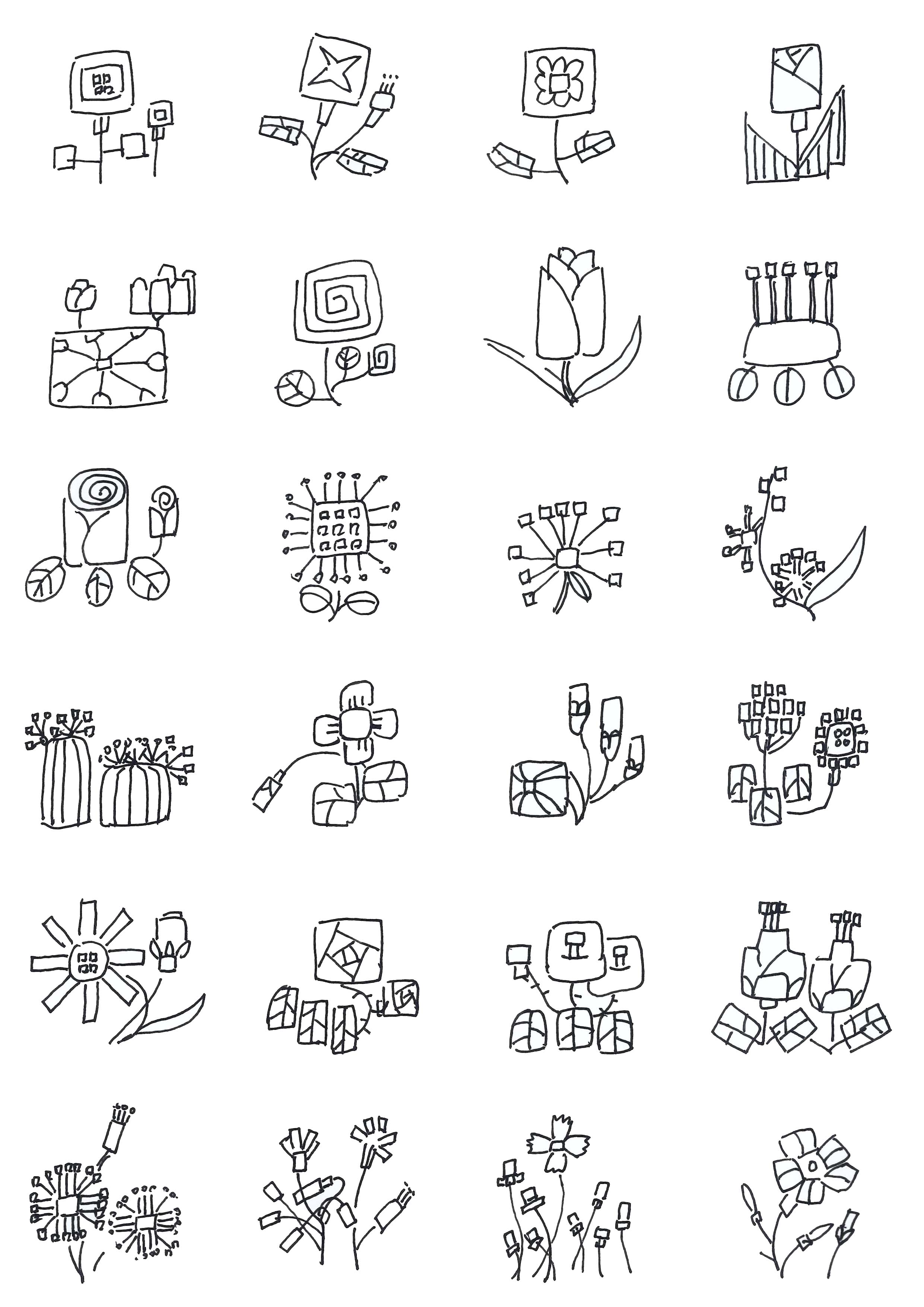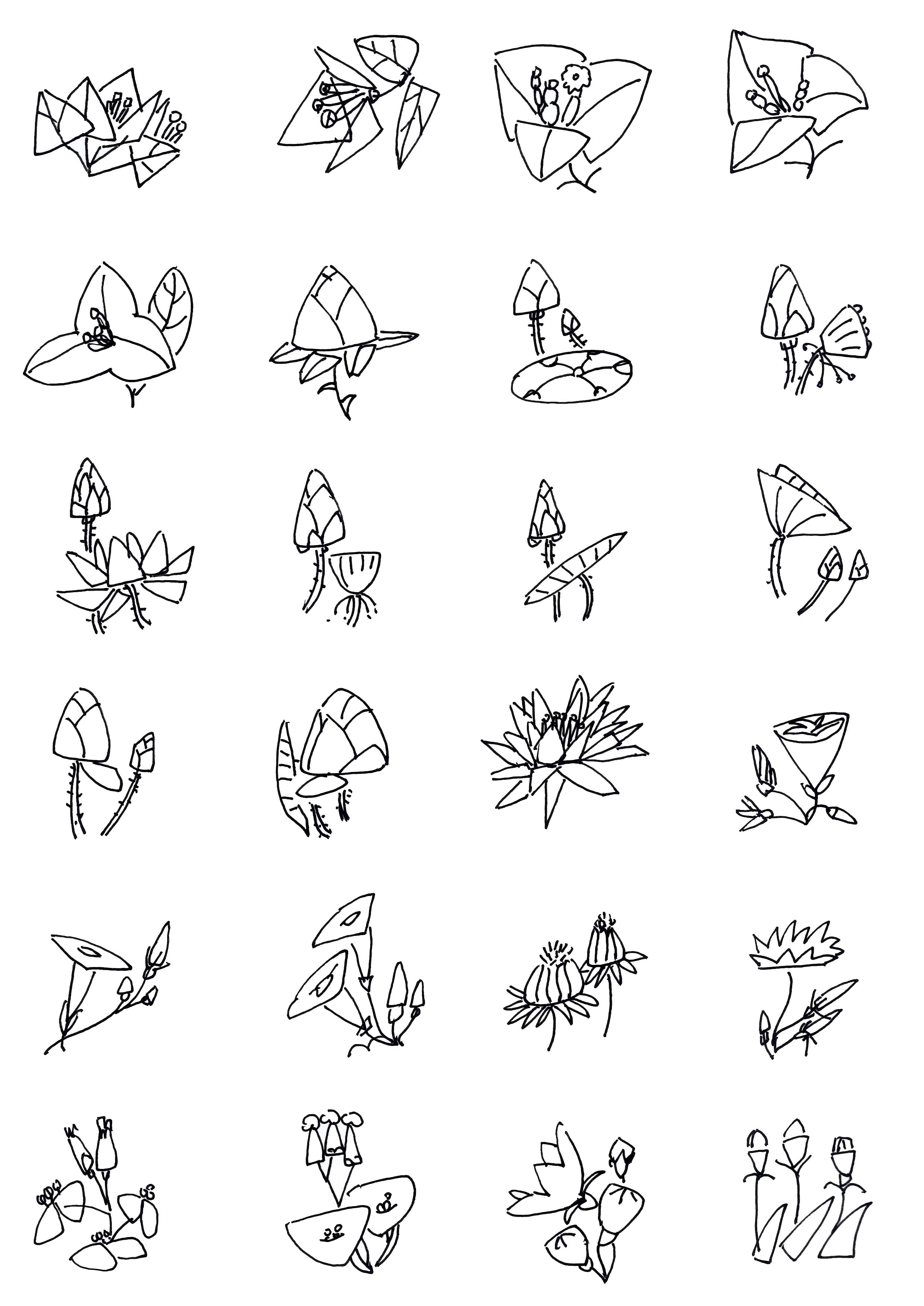 按花草简笔画画法步骤,用2B铅笔在速写本上临摹图2-25的花草简笔画三次以上。