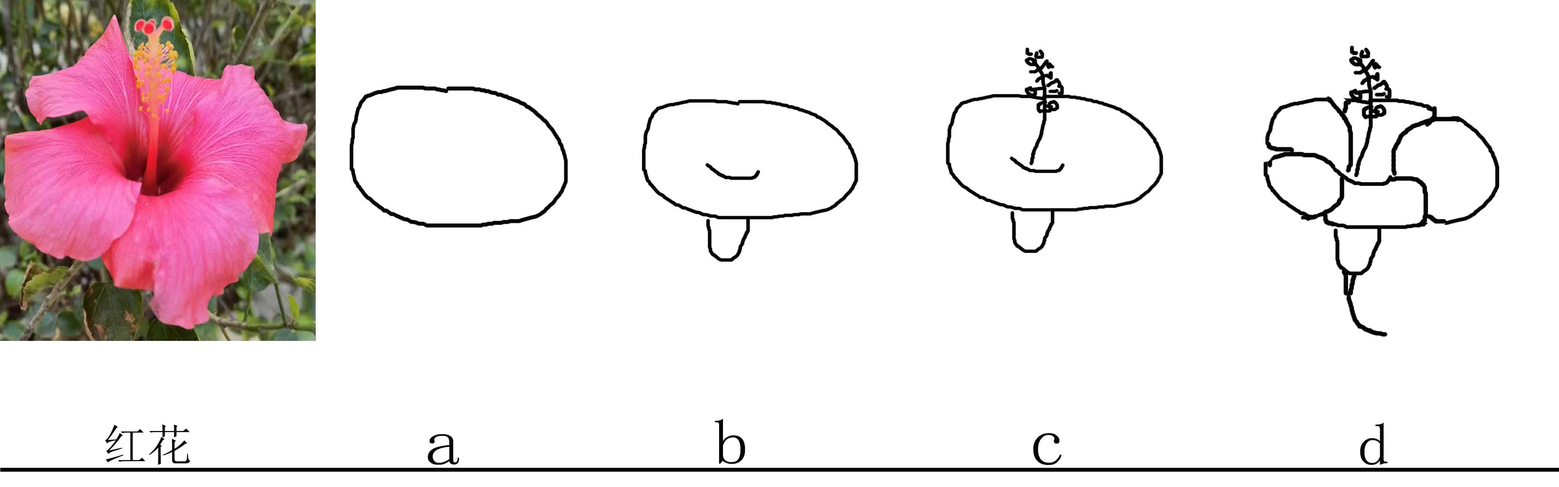 红花。圆形概括整体花形,围绕中心添画花的其它结构线。