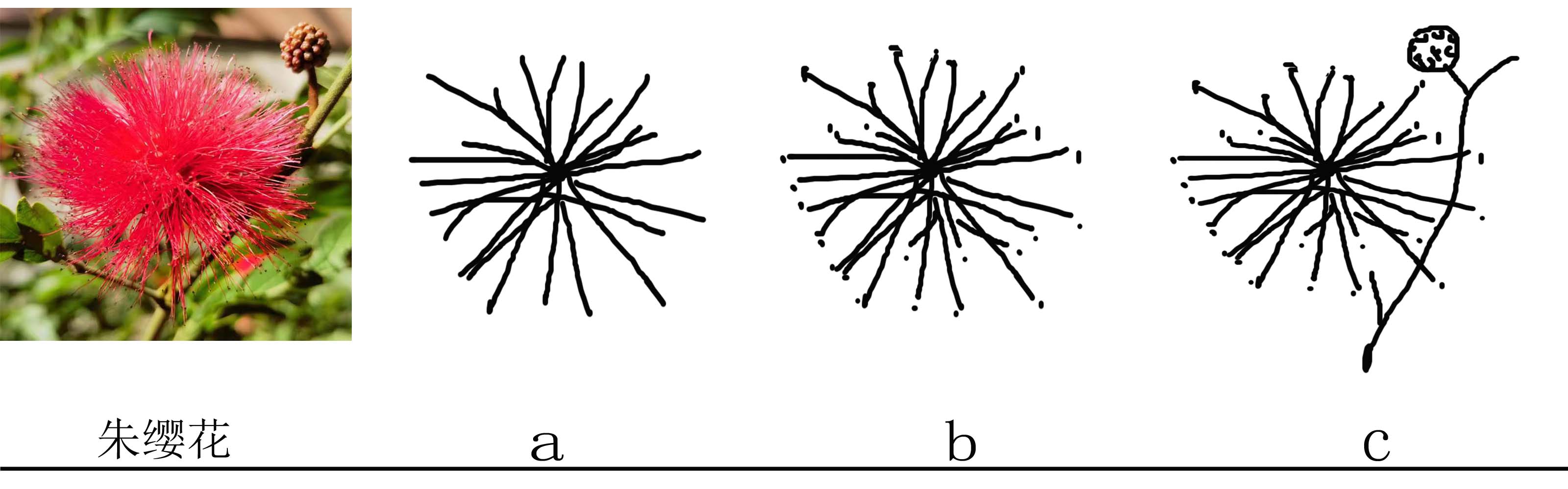 朱缨花。是由许多线从中心点向球形状发射构成的,再添花柄即可获得花形。