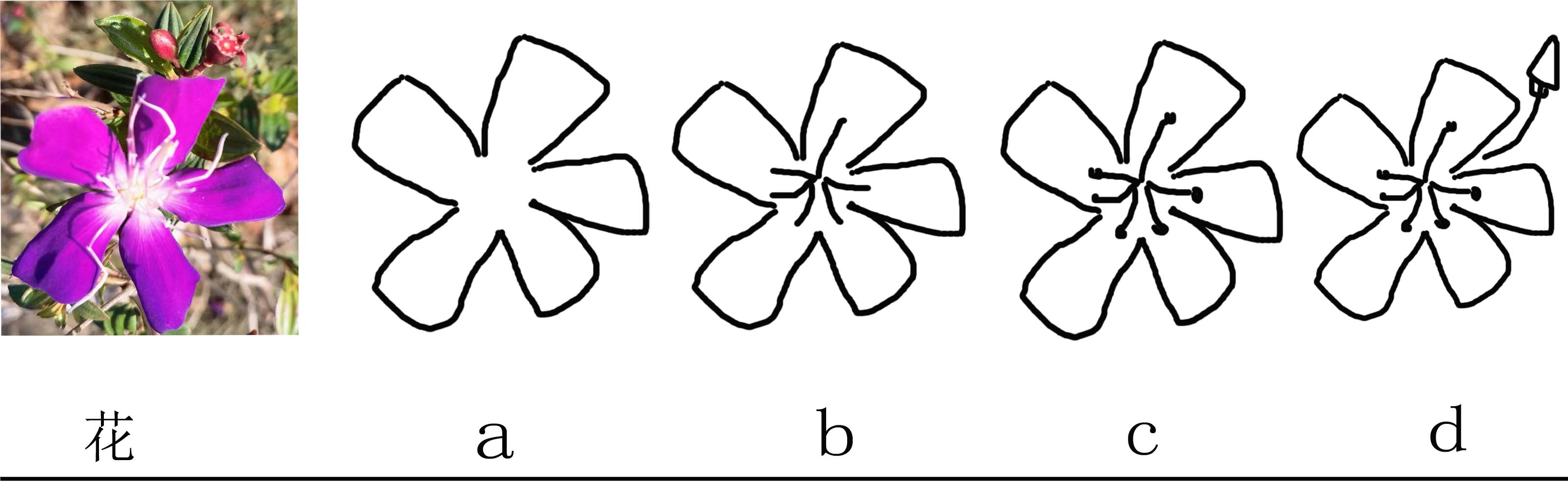 花。俯视方向有五瓣近似方形花瓣组成圆形的花,是最佳表现角度,中间添加花蕊,最后配以三角形的小花蕾,花就活灵活现了。