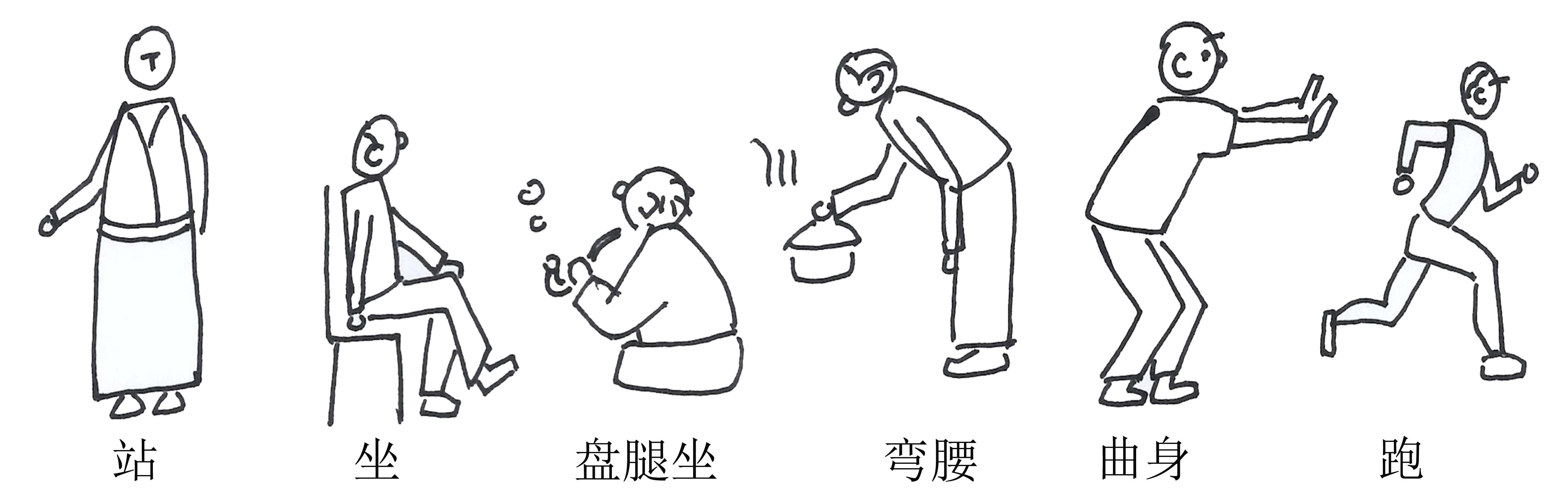 ③人的基本动态,人有站、坐、卧、行和跑的基本动态,如图2-94。