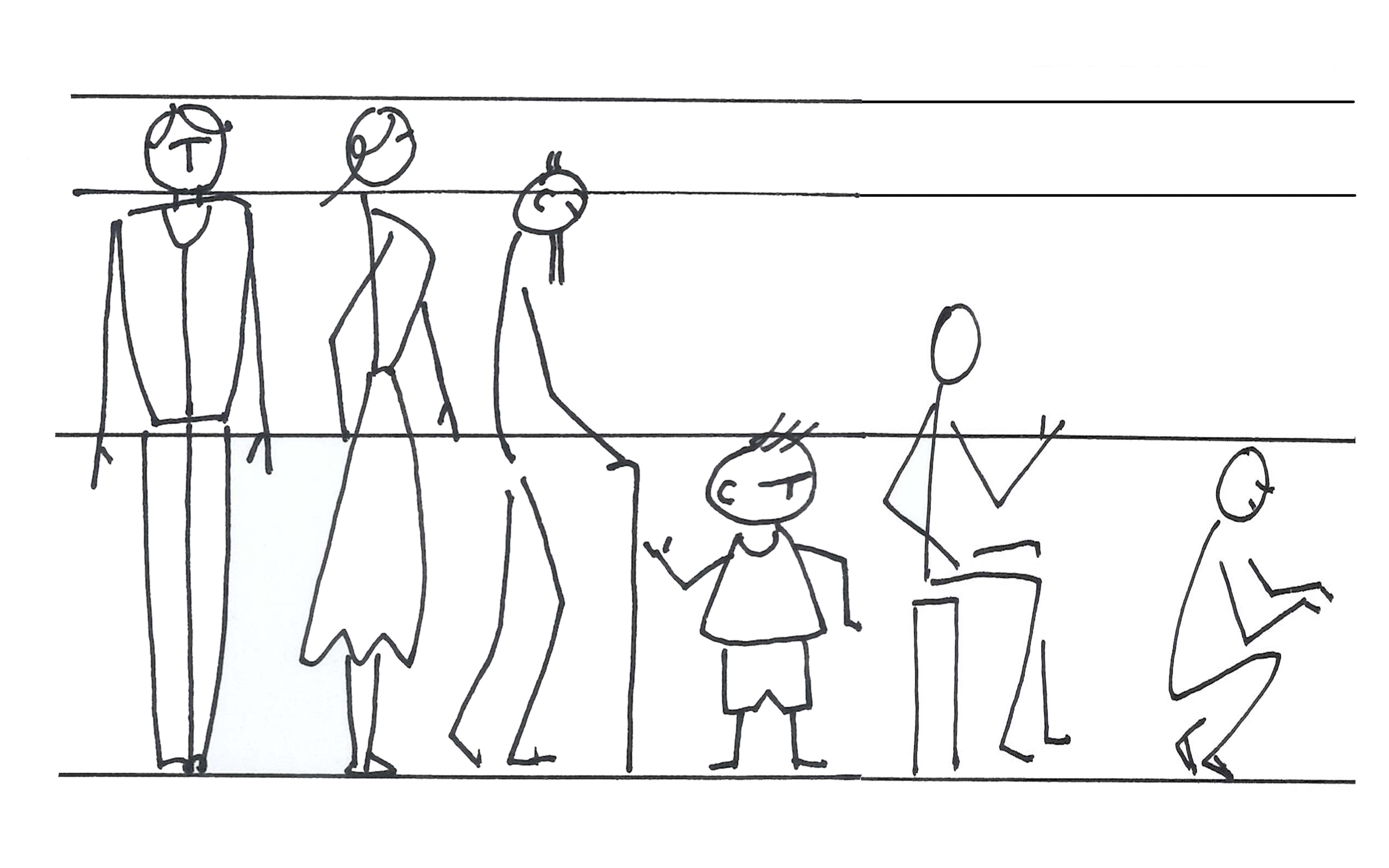 年龄不同,性别不同的高矮也是有区别的,各部分比例也是有差异的。用简笔画人物时,比例只需大概的准确就行了,如画成年人总体高度是八个头,把头与躯干合起来的高度与腿长一样就可以了,或者腿可以略长点。女性可将腿画长一点以显亭亭玉立。画小孩头和躯干占三分之二的高度,而腿可占三分之一长或略短点,头可略大点占三分之一高度更显稚气。老人由于背弯身缩肚垂,可将真个身体相应地画短点,加长胡子。“立七、坐五、蹲三半”,说的是人在不同姿势高度比例也不同,如图2-93。