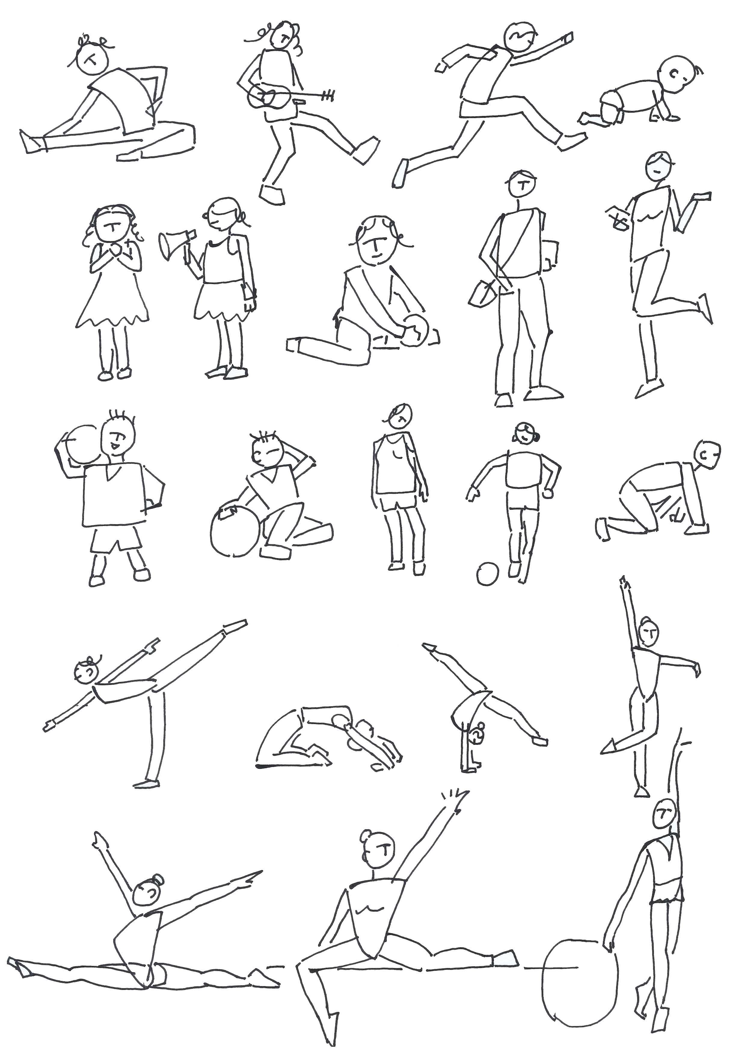 用2B铅笔在速写本上临摹图2-93、2-94和2-105的简笔画三次以上,巩固理解人的结构、比例和基本动态。