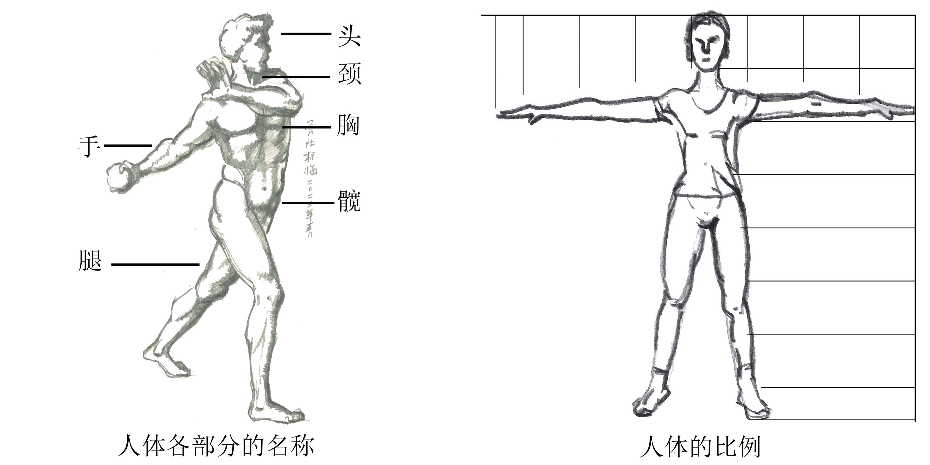 人体大致的比例是以头的大小为基本单位,计算的各部分之间的比例关系。全身高为七个半头,两臂平伸的全长等于身高如图2-92。两肩等于两个头宽,颈为半个头长,躯干高等于三个头长,上肢从肩末端至指尖等于三个头长,下肢至脚底等于四个头长,手的长度等于头长的四分之三,脚的长度等于一个头长等。五官在头部的比例是符合“三停五眼”关系的,眼睛瞳孔的连线是头的横中线,两眉间与鼻子形成的线是头部的纵中线。