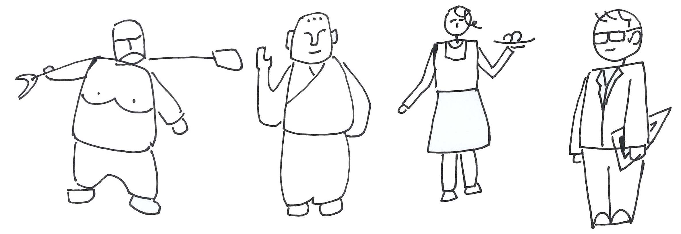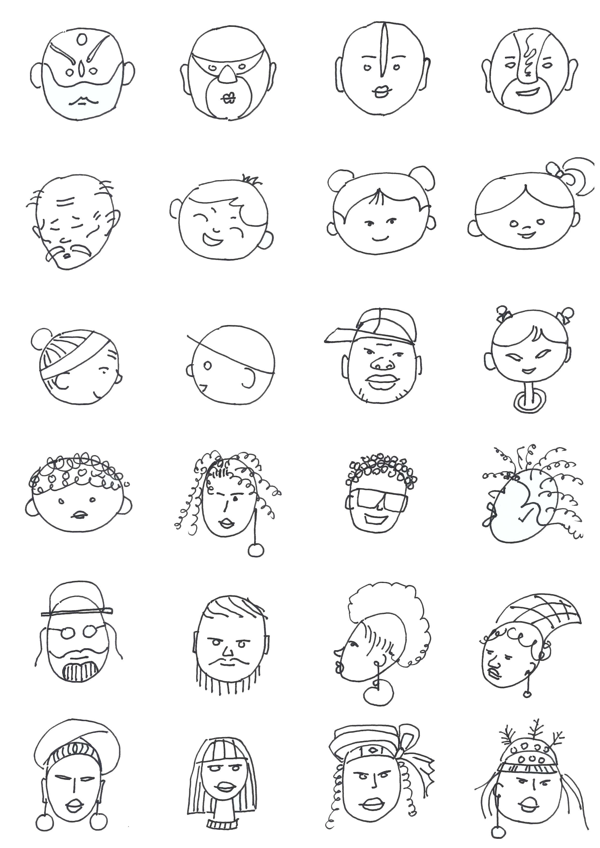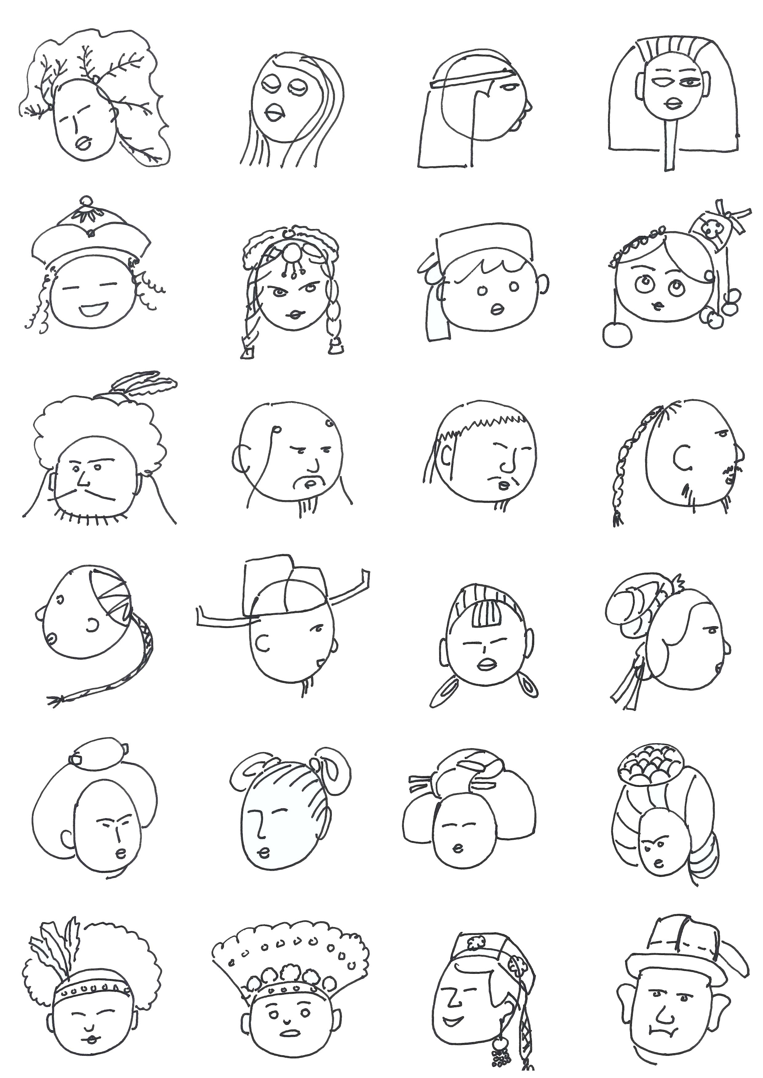在图2-101的基础上表现男女、职业和民族不同的人物简笔画,如图2-102。
