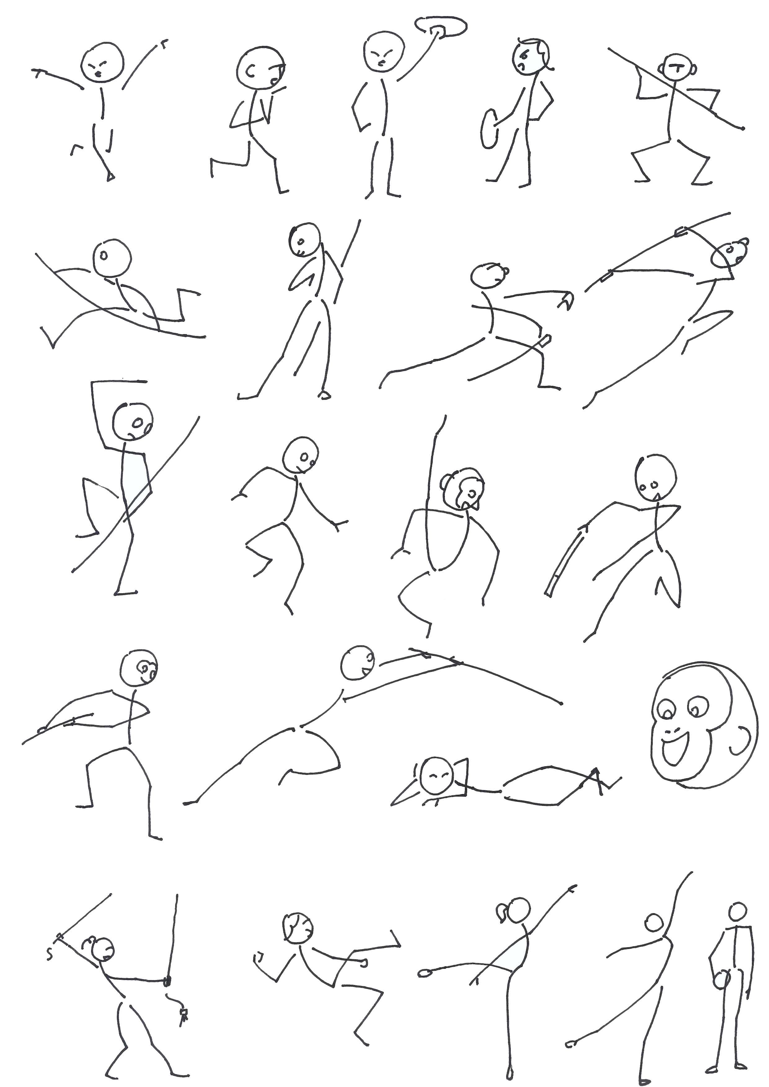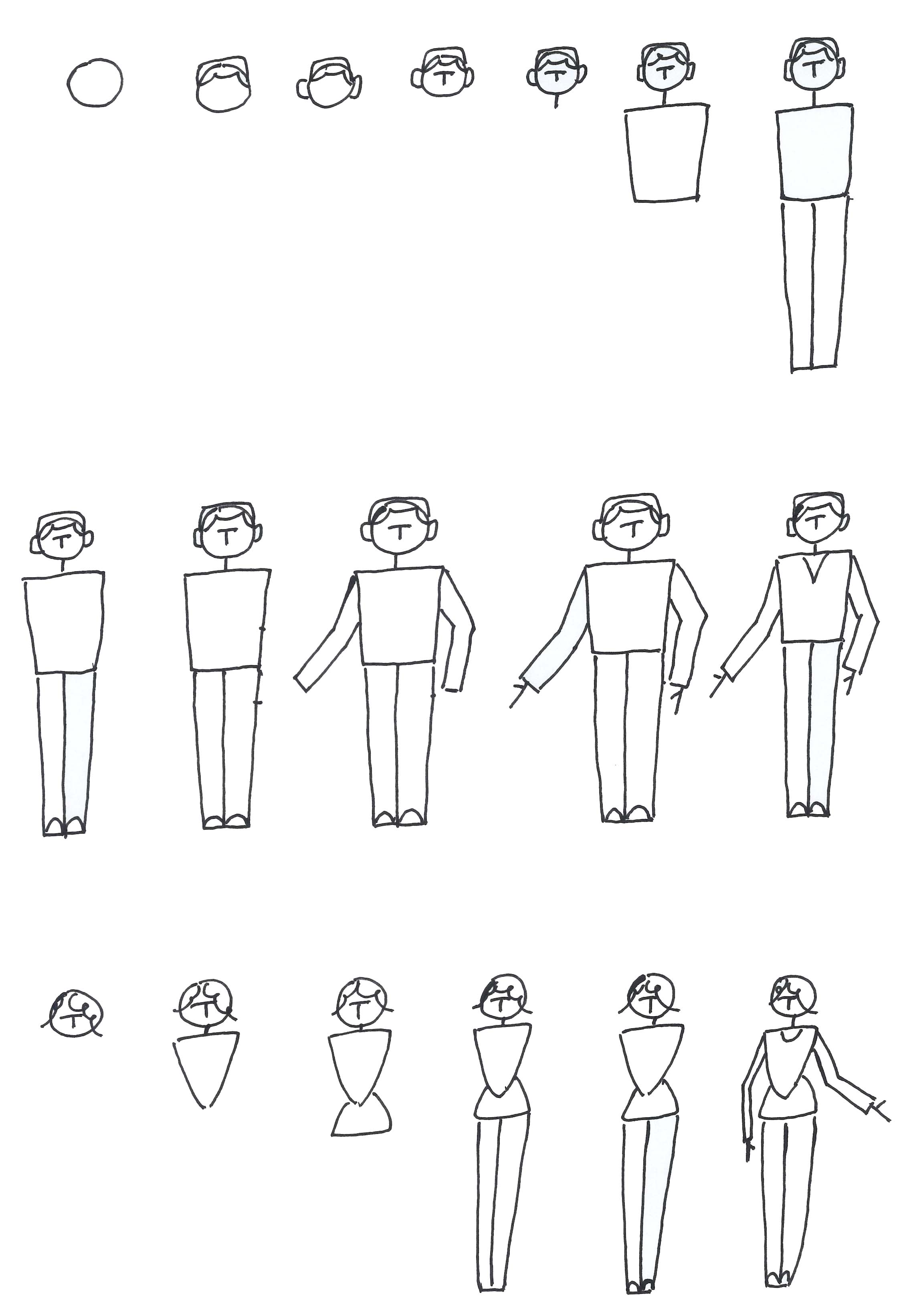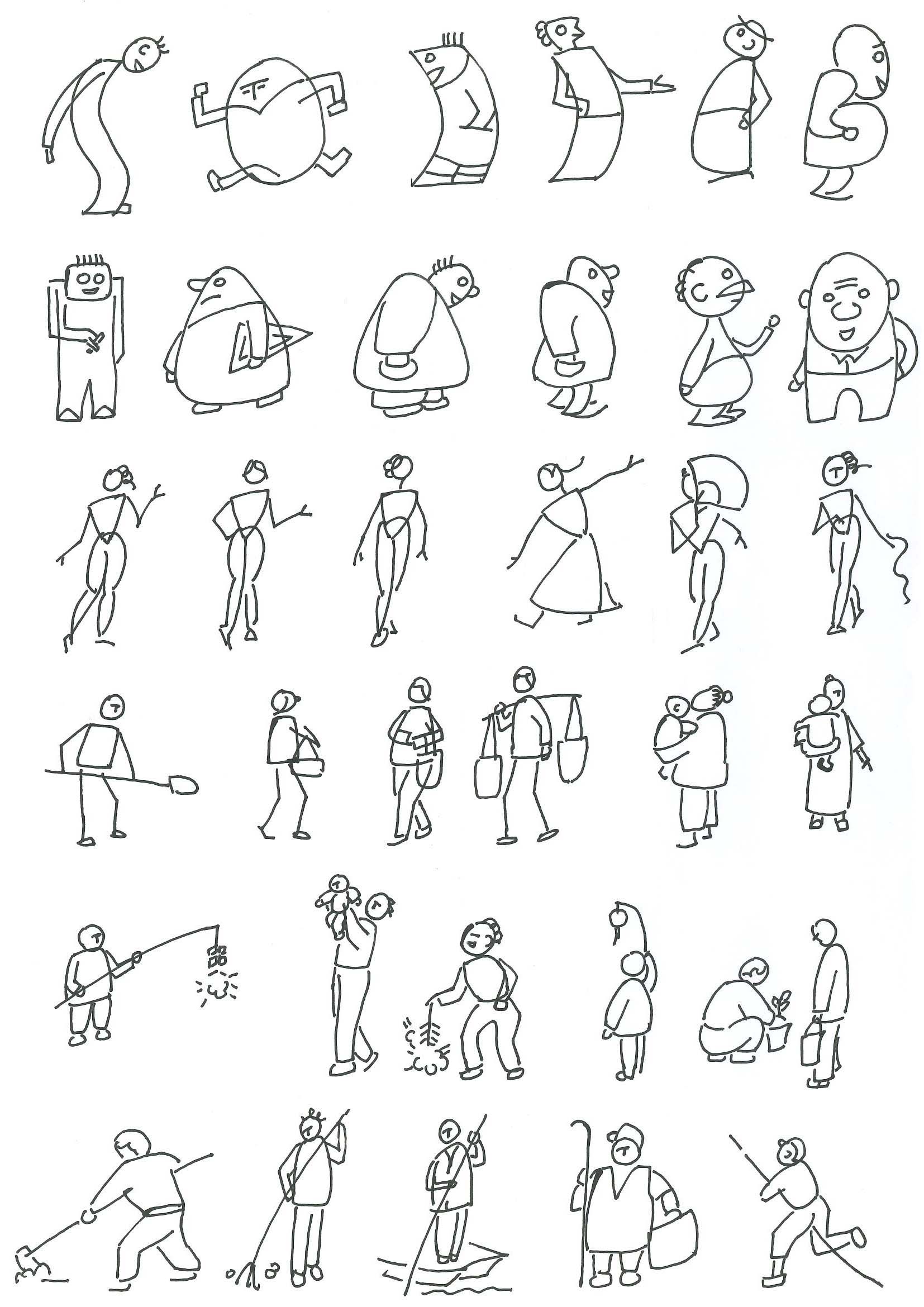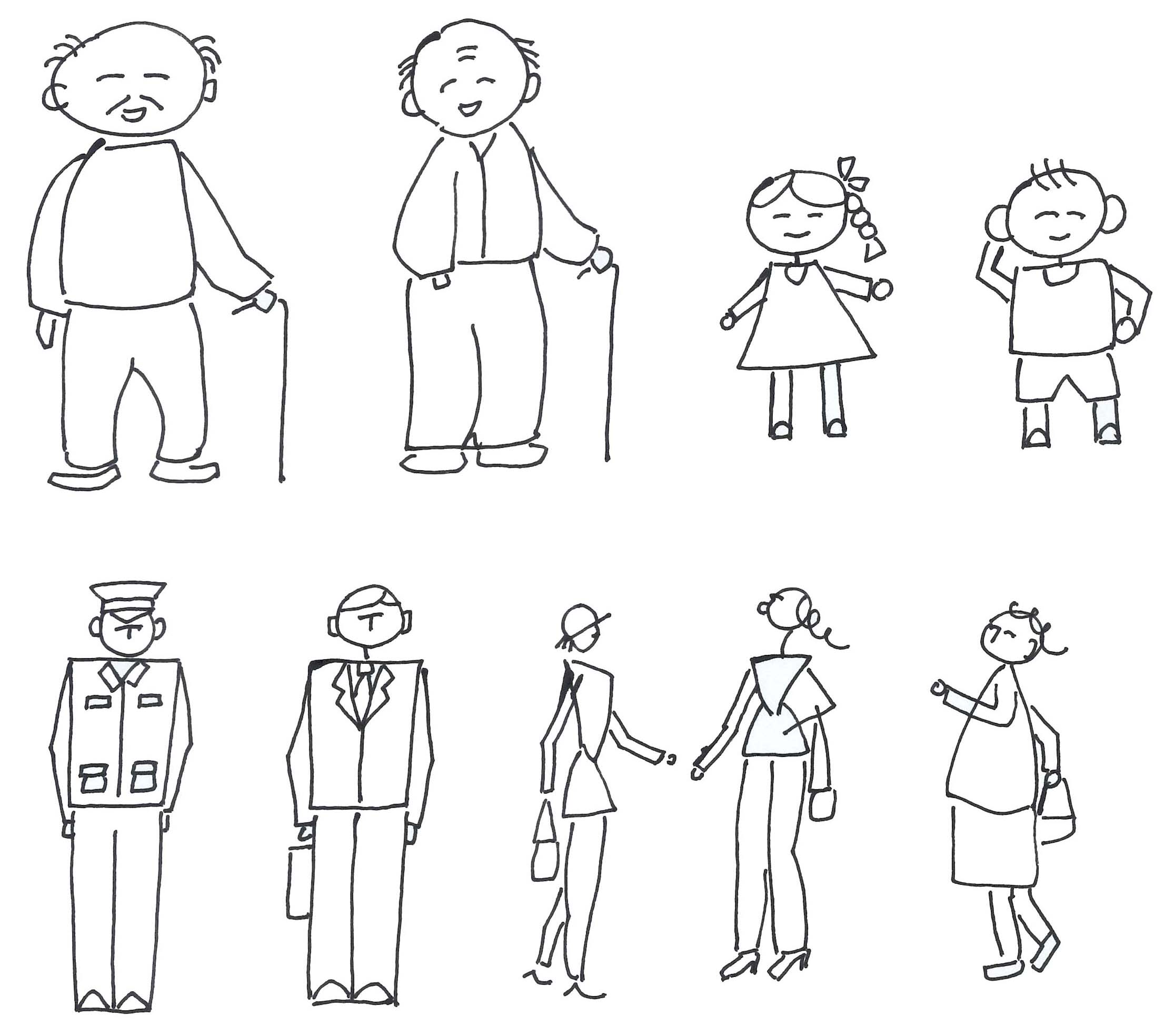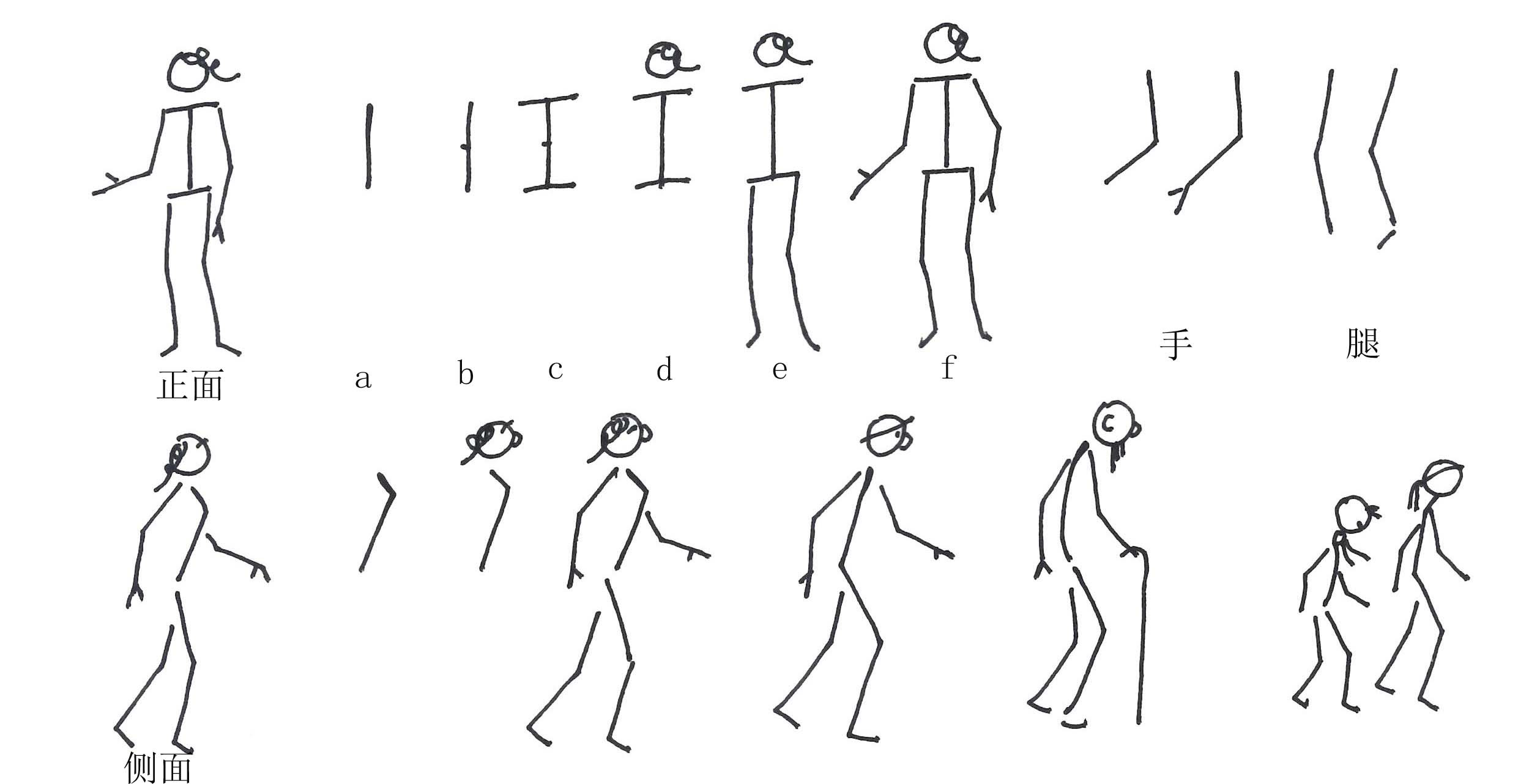 利用简笔画程式符号添上人的肢体特征这样的方法,再设计一些常用的不同性别、动态、老少的人物符号给学习者参考,这些符号有规律且容易记忆,不要求太精准的比例与结构,学习者多画几次便能掌握。这种方法能够获得好的教学效果,以下逐一介绍