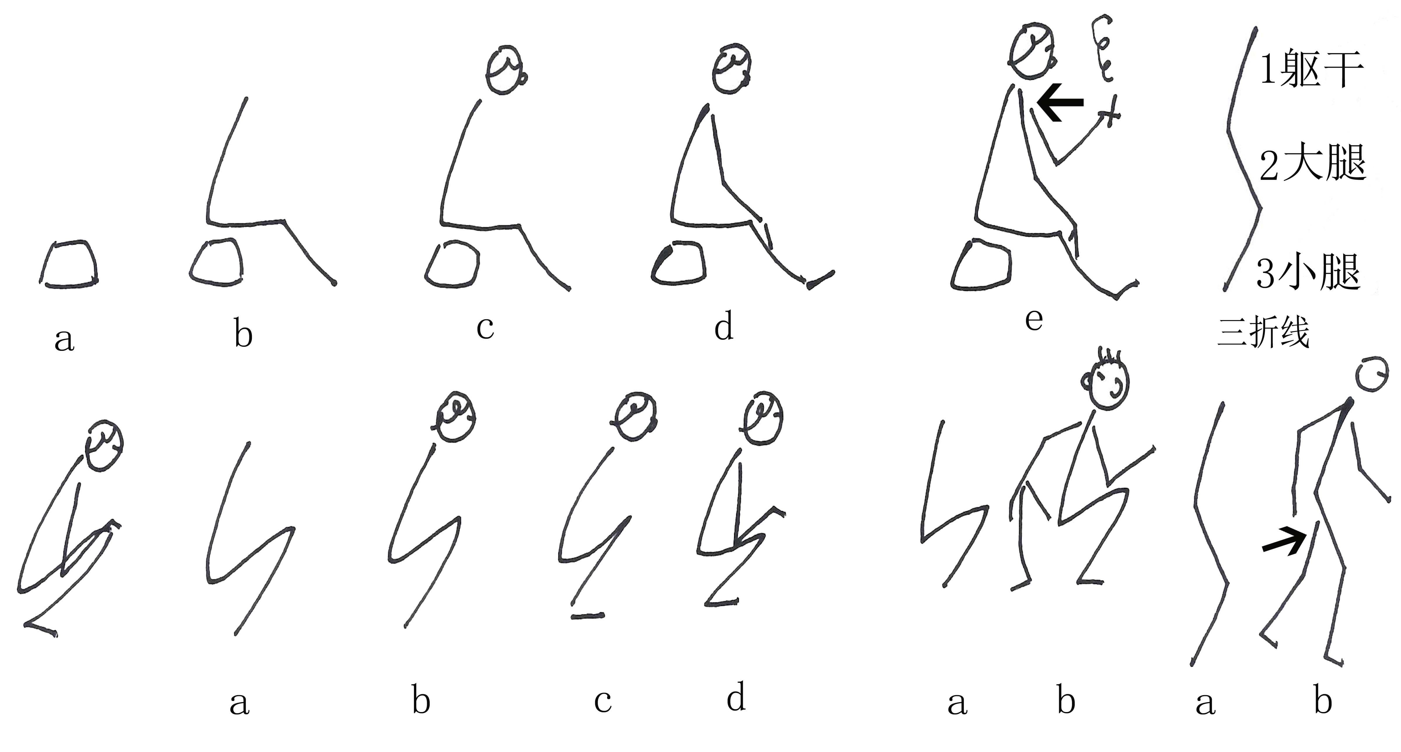 ④三折线法。在教学实践中,为了更快速地画出图形配合讲课,笔画越少形象越程式化越能达到这种要求,把躯干、大腿和小腿用一根三折线表示,然后再添上人的其它部位,我们称为三折线法,如图2-99。三折线类似“S”字和“Z”字形。