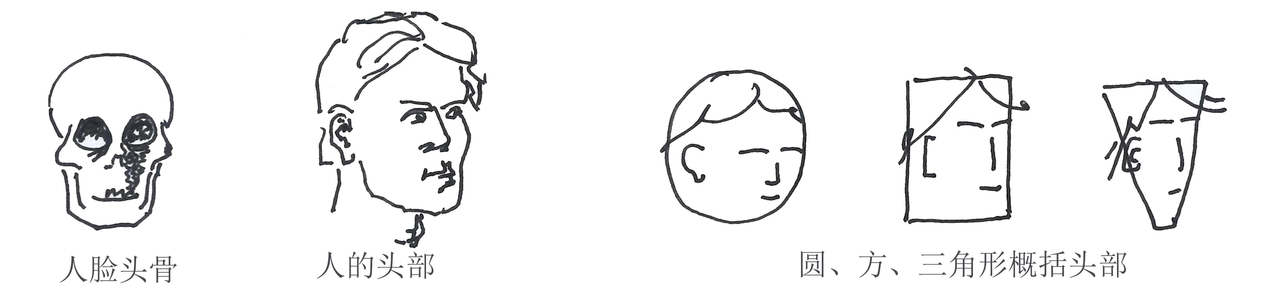 ①用方形、圆形、三角形概括人物各部分基本形画法。