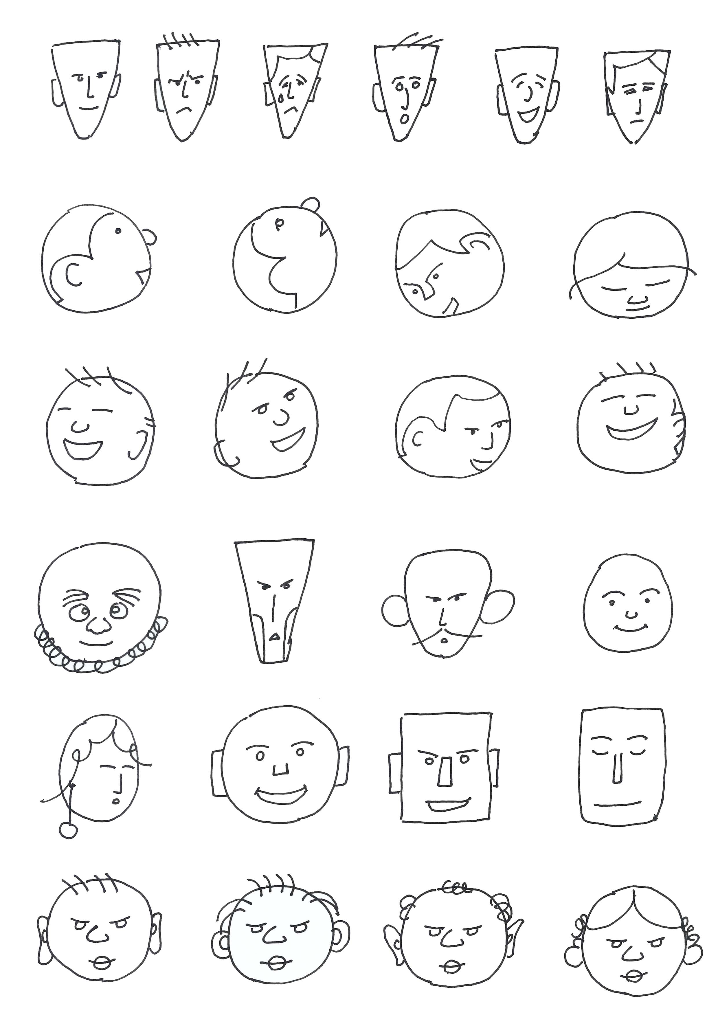 人物头部的简笔画,我们可以用圆形、方形和三角形概括整体头型,再添上五官和发型符号,笔画越少能表现出头的特点就越好,如图2-100‘