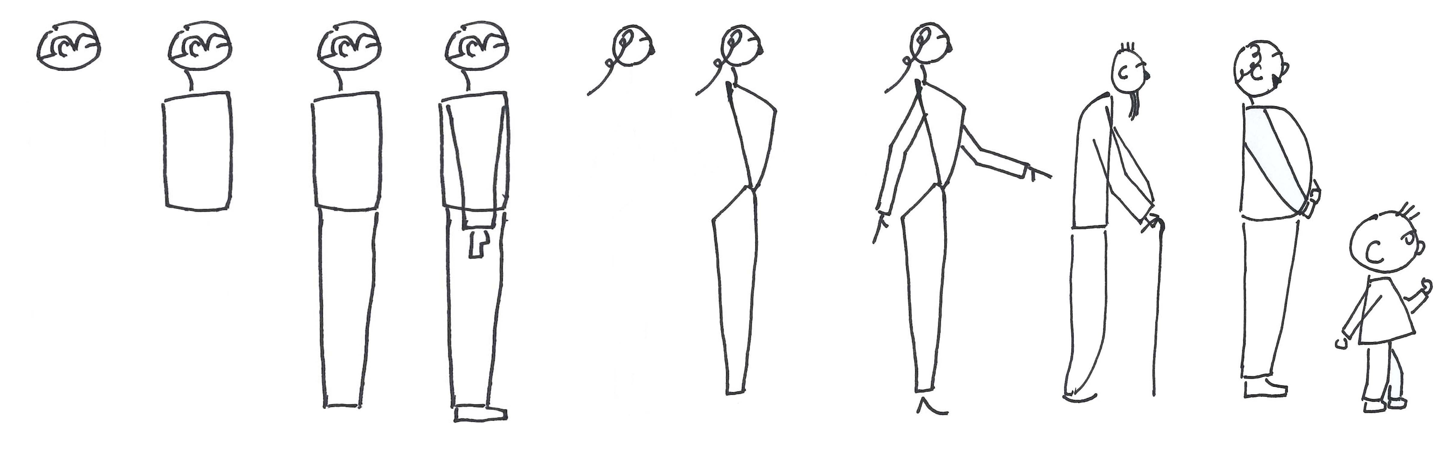 侧面。年轻男性以圆形画头,短线画脖子,方形画躯干及四肢;简笔画表现侧面女性以圆形画头,三角形画躯干及腿更适于表现女性特征,方形画手。老人背弯方形左上角为弧形,中年肚子突出以半圆画躯干,梯形画小孩躯干,头的比例大,如图2-95。
