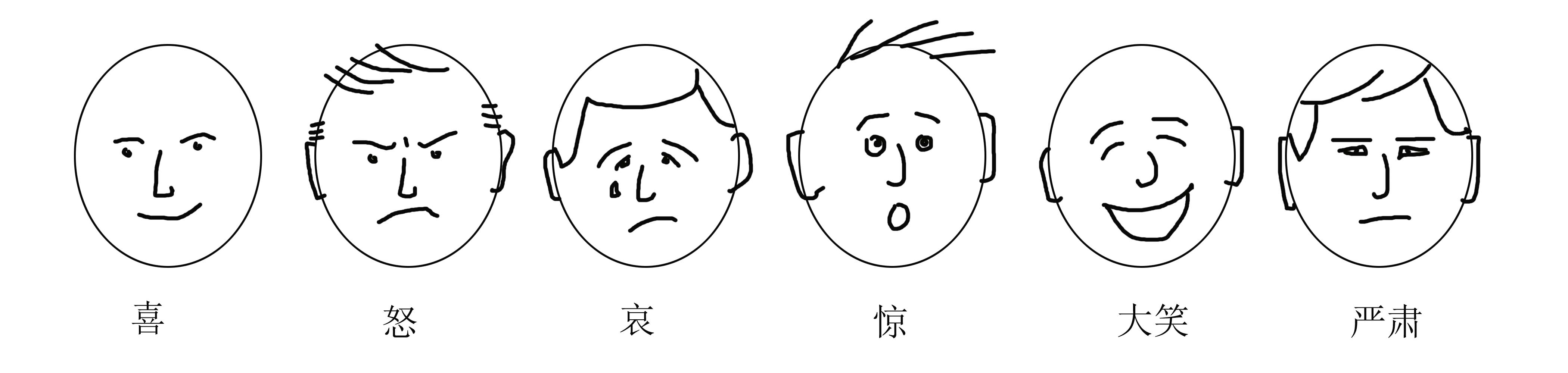 ②分别将人物的头部表情喜、怒、哀、惊、大笑、严肃等表现出来。