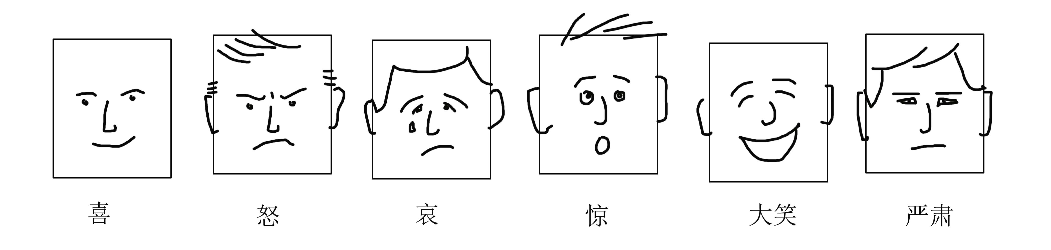 分别用三角形、方形、圆形概括人物头部形象,并用点、线、形表现人的喜、怒、哀、惊、大笑、严肃等表情。