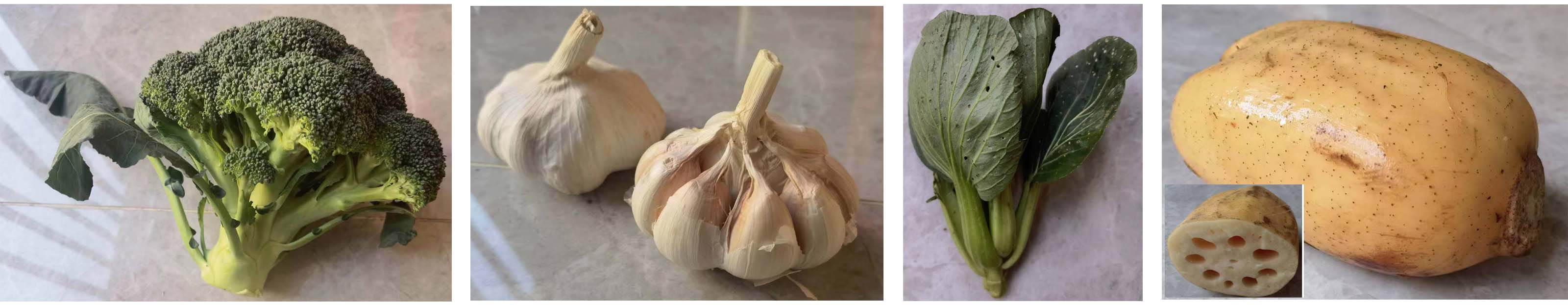 ①用简笔画画出图片中的花菜、蒜头、青菜和莲藕等等。